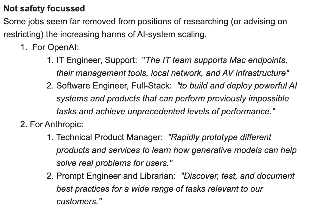 Re: On whether OpenAI could make a role that feels insufficiently truly safety-focused: there have been and continue to be OpenAI safety-ish roles that we don’t list because we lack confidence they’re safety-focused.