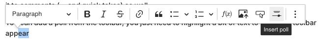 You can add a poll from the toolbar, you just need to highlight a bit of text to make the toolbar appear: