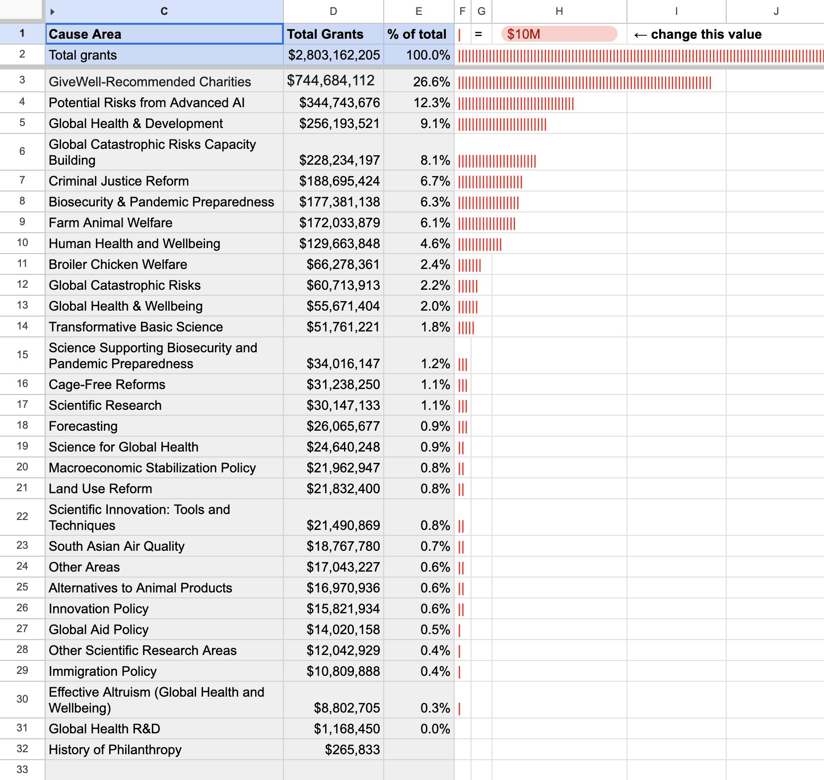This is great. Do we know if all grants are assigned to only one area? In other words, if I want to know the total amount spent on farmed animal welfare more broadly, is it appropriate to add up the sums for "Farmed Animal Welfare" + "Broiler Chicken Welfare" + "Cage-Free Reforms" + . . . .