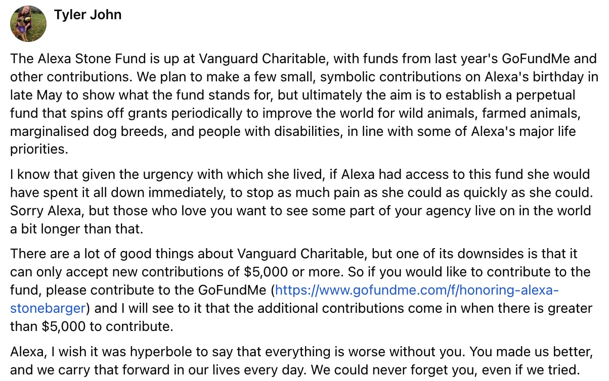 Thanks for writing this beautiful tribute. I didn’t know Alexa, but am inspired by them. It is hard to look clear-eyed at the sheer amount of suffering and cruelty in this world without shifting into calculus (i.e., only pursuing cost-effective solutions) or complacency. It sounds like Alexa was steadfast in their compassion, taking seriously the moral worth of each creature, and doing everything in their power to give them better lives. The world is a better place for them having been here, and I am so sorry they are gone.