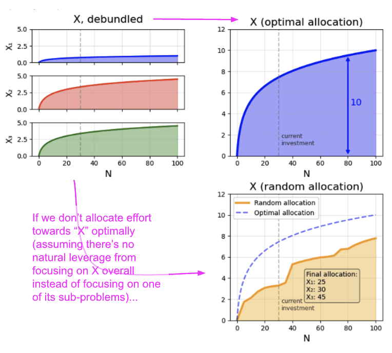 In particular, let’s start by assuming that our broad area X (e.g. “preparing for the IE”) does not have synergies / cross-cutting interventions — such that we can basically just treat it as a bundle of distinct sub-domains. Then for the assumptions underpinning ITN to hold, we need to believe that ~each additional unit of investment in the overall bundle will be allocated optimally across the sub-domains. If we assumed, instead, that additional units would be allocated randomly across the areas, then even if investment in each of those areas follows a standard log curve, overall progress would look a fair bit worse (see yellow curve below):