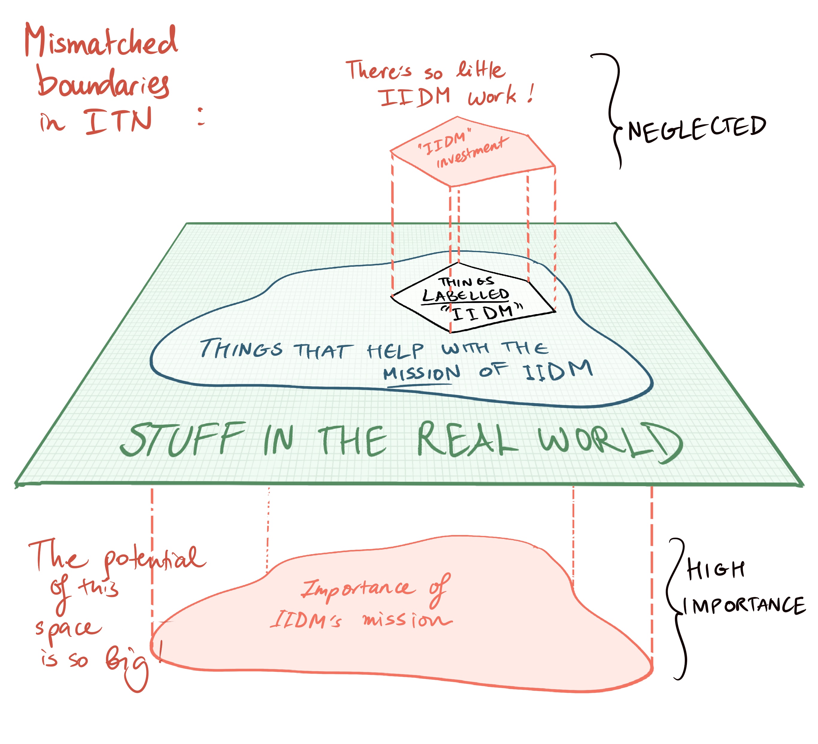 Let's take “improving institutional decision-making” (IIDM) as an example. We might try to estimate a (baseline for) “importance” by asking how valuable it would be if key institutions were more sane (by some measure). We might then be tempted to estimate “neglectedness” in terms of the number of people working explicitly on “IIDM.”