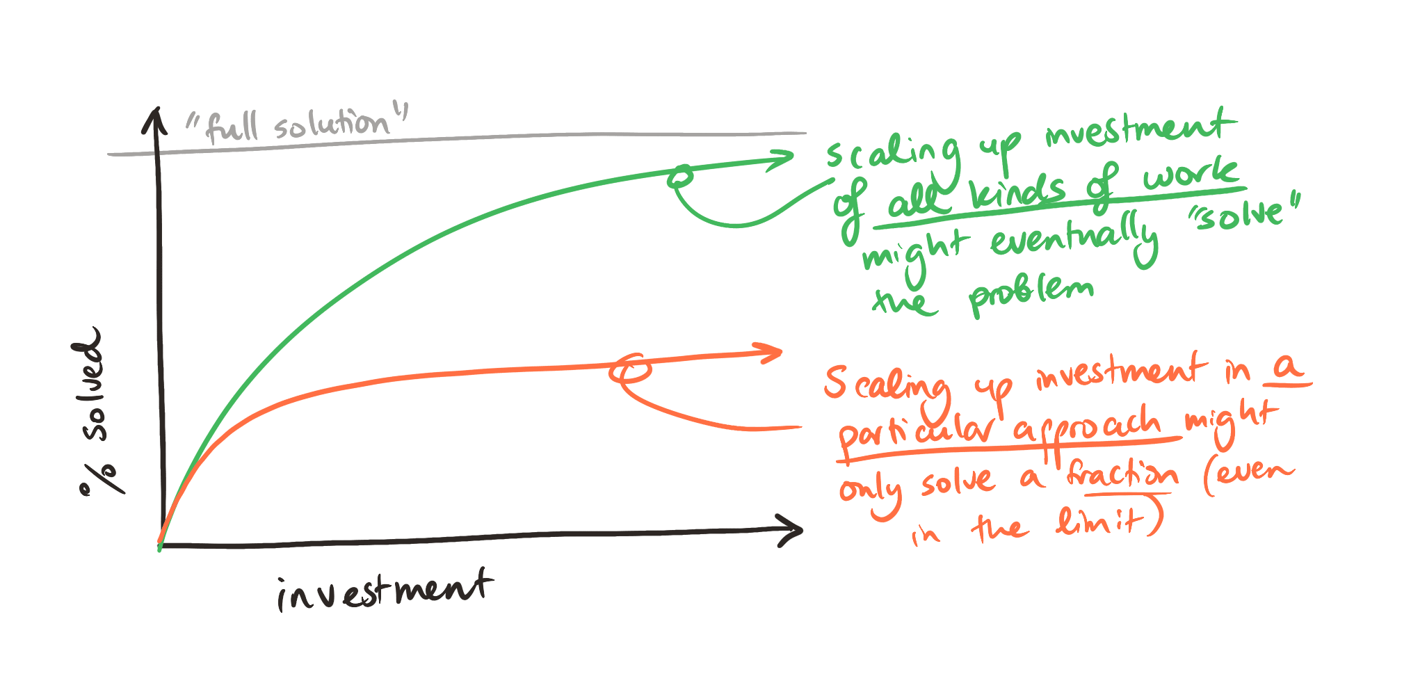 We sometimes use ITN to evaluate approaches (e.g. vaccines, alternative proteins, IIDM, AI alignment) instead of problems (people getting sick, farmed animal welfare, ...). This requires some care, as the approach we're considering may only be able to solve a small fraction of the underlying problem — even with unlimited investment. (For instance, I think no amount of investment in technical alignment research could reduce the risks of rogue AI agents making the Earth uninhabitable to humans to ~0.) In extreme cases, our approach could be a total dud.[4]