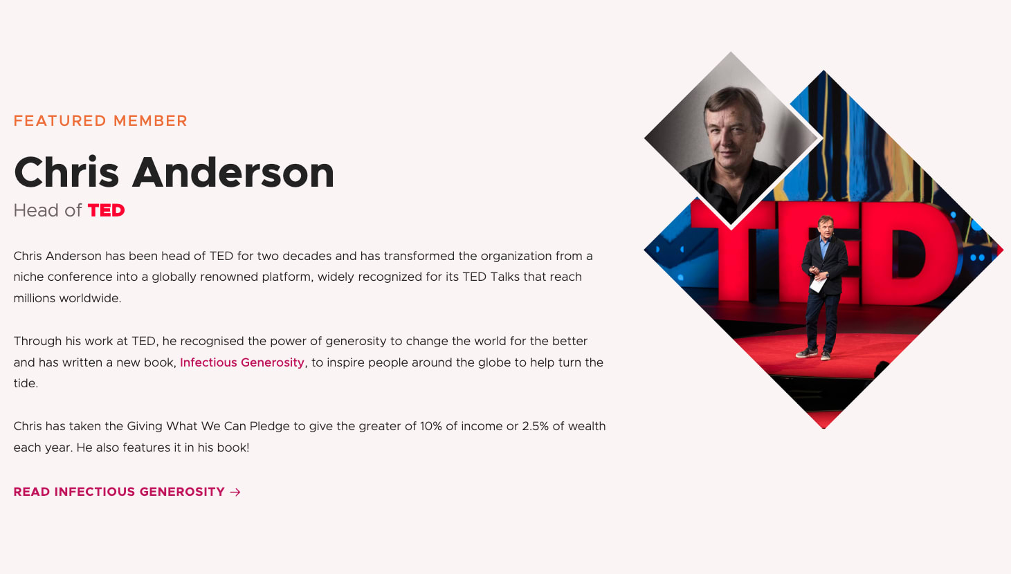Chris Anderson, Head of TED, has just released a new book called Infectious Generosity, which has a whole chapter that encourages readers to take the Giving What We Can Pledge! He has also taken the Giving What We Can Pledge with the new wealth option to give the greater of 10% of income or 2.5% of wealth each year.
