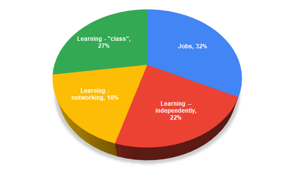 From late 2023 to December 2024, I spent ~740 hours on my late-stage career pivot. Two-thirds of the time, I learned with others (27% in classes and 18% networking) and on my own (22%). The remainder (32%) was split between applying for jobs, creating a job, and doing operations-related paid work as a contractor.