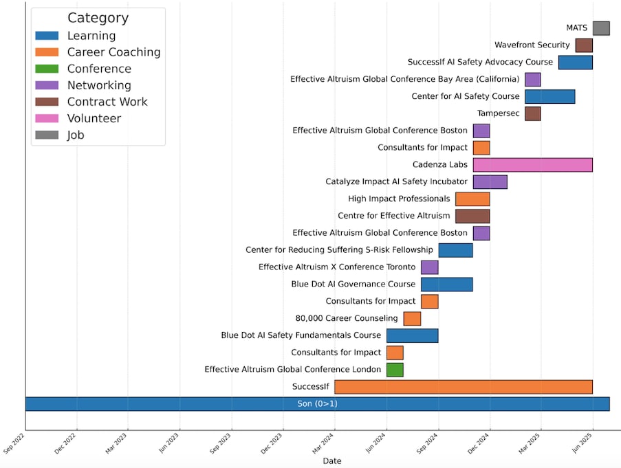 Securing the Operations Director position at MATS was the culmination of many steps over time. One led to the next. Each seemed directionally correct and valuable. It's remarkable how all these various touchpoints—the conferences, the programs, the contract work, the networking—all came together to create the foundation for landing at MATS. I don’t believe the combination of those activities was essential, but they were what I needed to find an impactful role supporting AI safety research.
