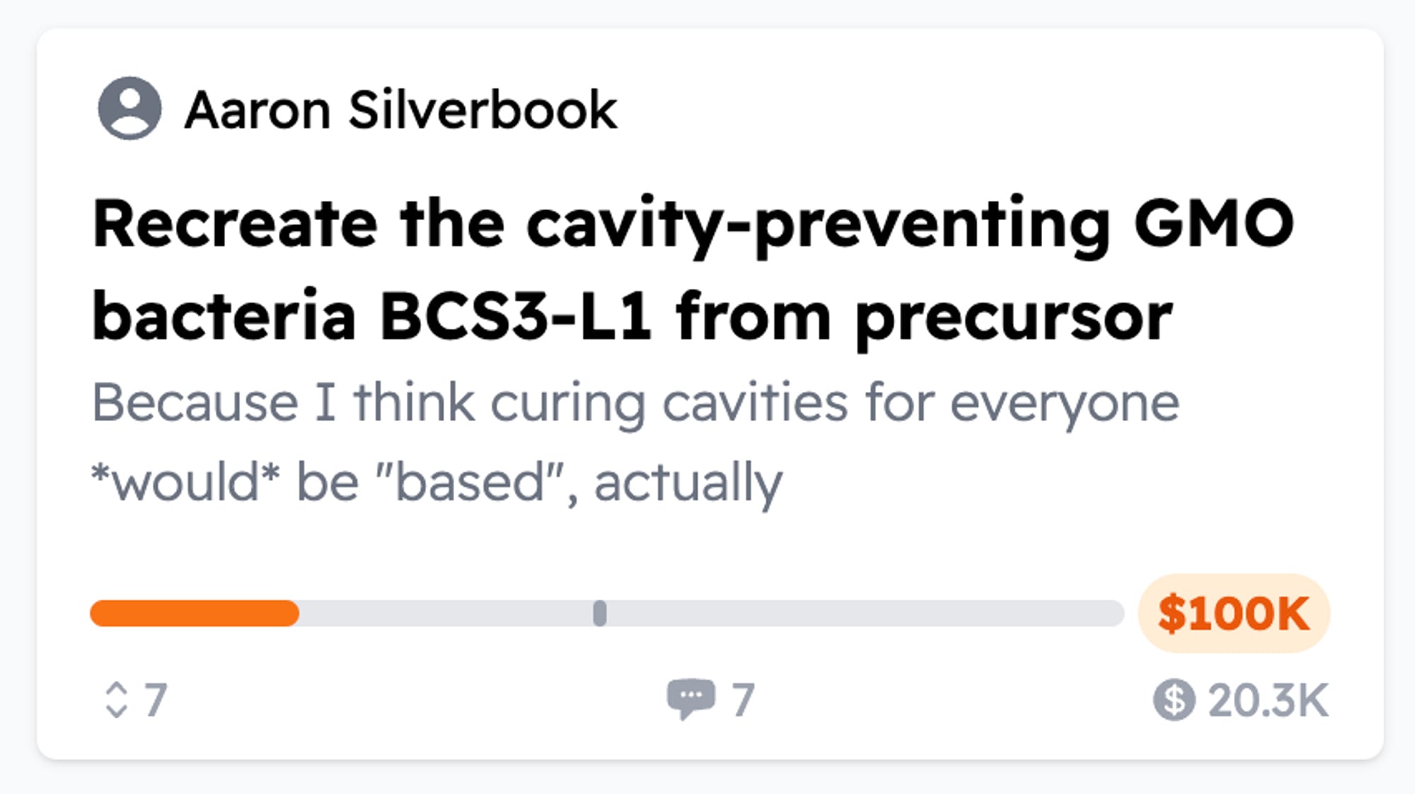 A proposal to cure cavities, forever. Very out-of-left-field (Aaron: “it certainly isn't great for our Weirdness Points budget”), but I’m a fan of the ambition and the team behind it. We’re currently seeing how Manifund can make an equity investment in Lantern Bioworks.
