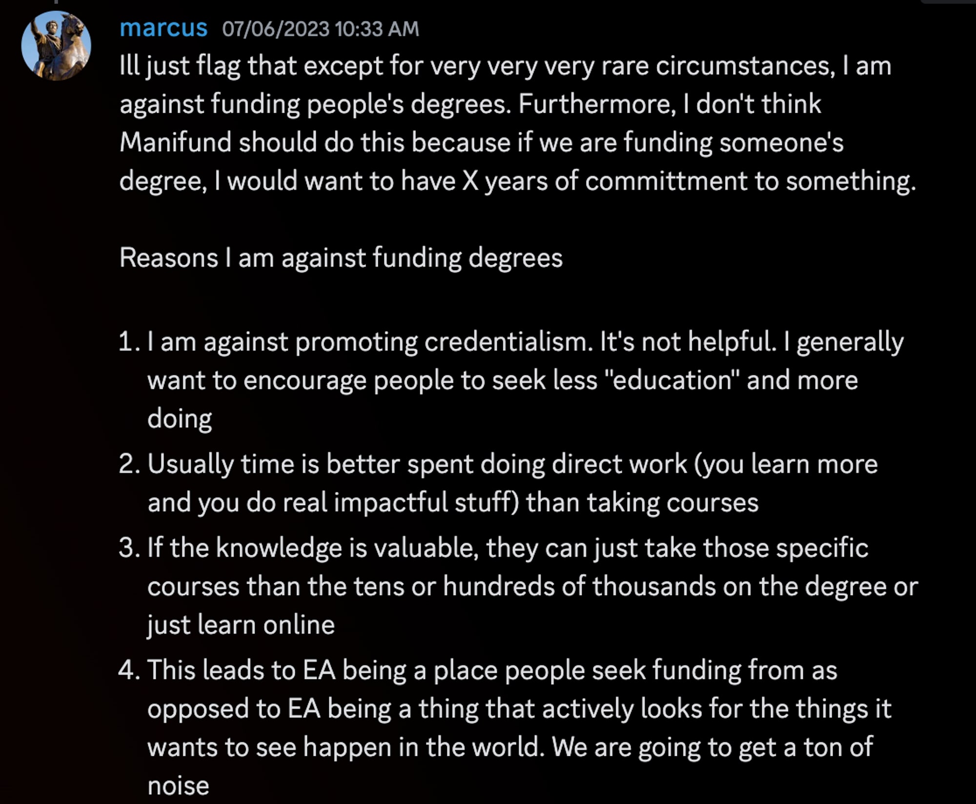 On Discord, Marcus leads with a spicy take: 13 reasons why EA funders should avoid paying for degrees…