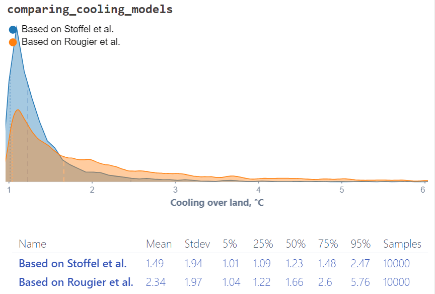 Diagram: the distribution of cooling levels in volcanic events with at least 1°C of cooling over land, under models based on two different data sources. Rougier et al. data led to more severe cooling predictions, but lower annual risk predictions.