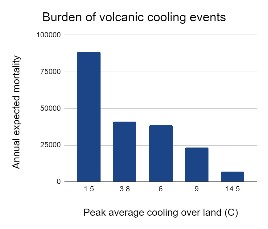 Most of the expected damage of these catastrophes comes from milder events with 1-4°C of cooling. All together, I estimate the annualized burden at around 200,000 deaths per year. However, there is a lot of uncertainty about the risk, and associated damage, of global volcanic cooling events.