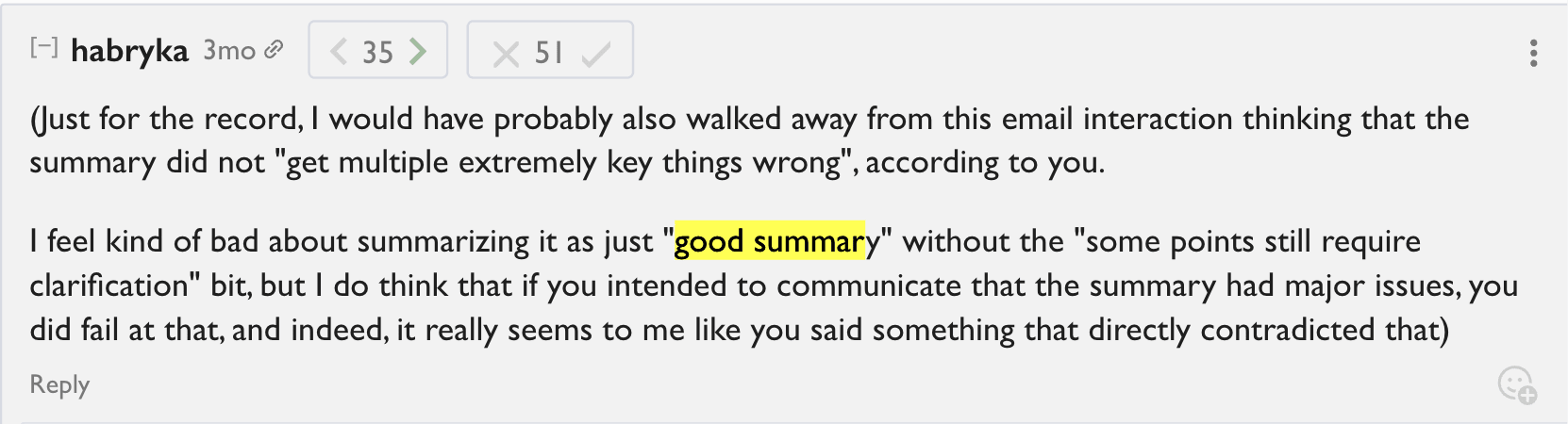 - Having a substantive response may also have reduced the chances that Nonlinear would resort to approaches such as legal threats, that (in my view) did not succeed, and rather ended up backfiring for Nonlinear in the court of public opinion.