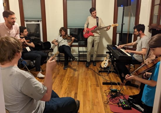 Since people were coming from out of town and probably wouldn't have their own instruments, I set up the room with a range of options: keyboard, footdrums, electric bass, electric mandolin, (classical) guitar, violin, shakers, sousaphone, baritone, trumpet, whistle, etc. A friend brought their flute and steel-string guitar. This was probably overkill: mostly people were interested in the keyboard, steel-string, bass, mandolin, and drums.