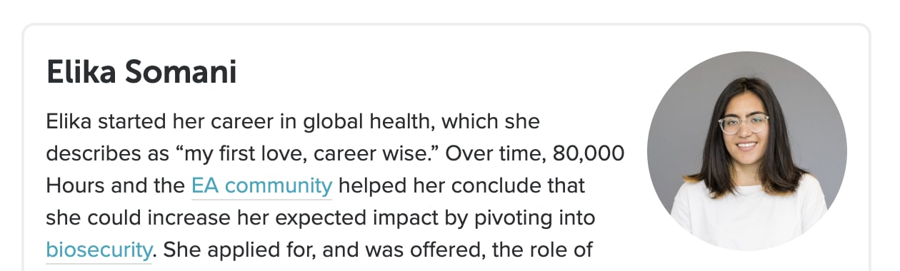 "Ideally a reader who shifted from a neutral or only very-mildly-good career to a great career would be better (as they do for their other examples). I'd guess 80K know some great examples? Maybe someone working exclusively on rich-country health or pharma who moved into bio-risk?"