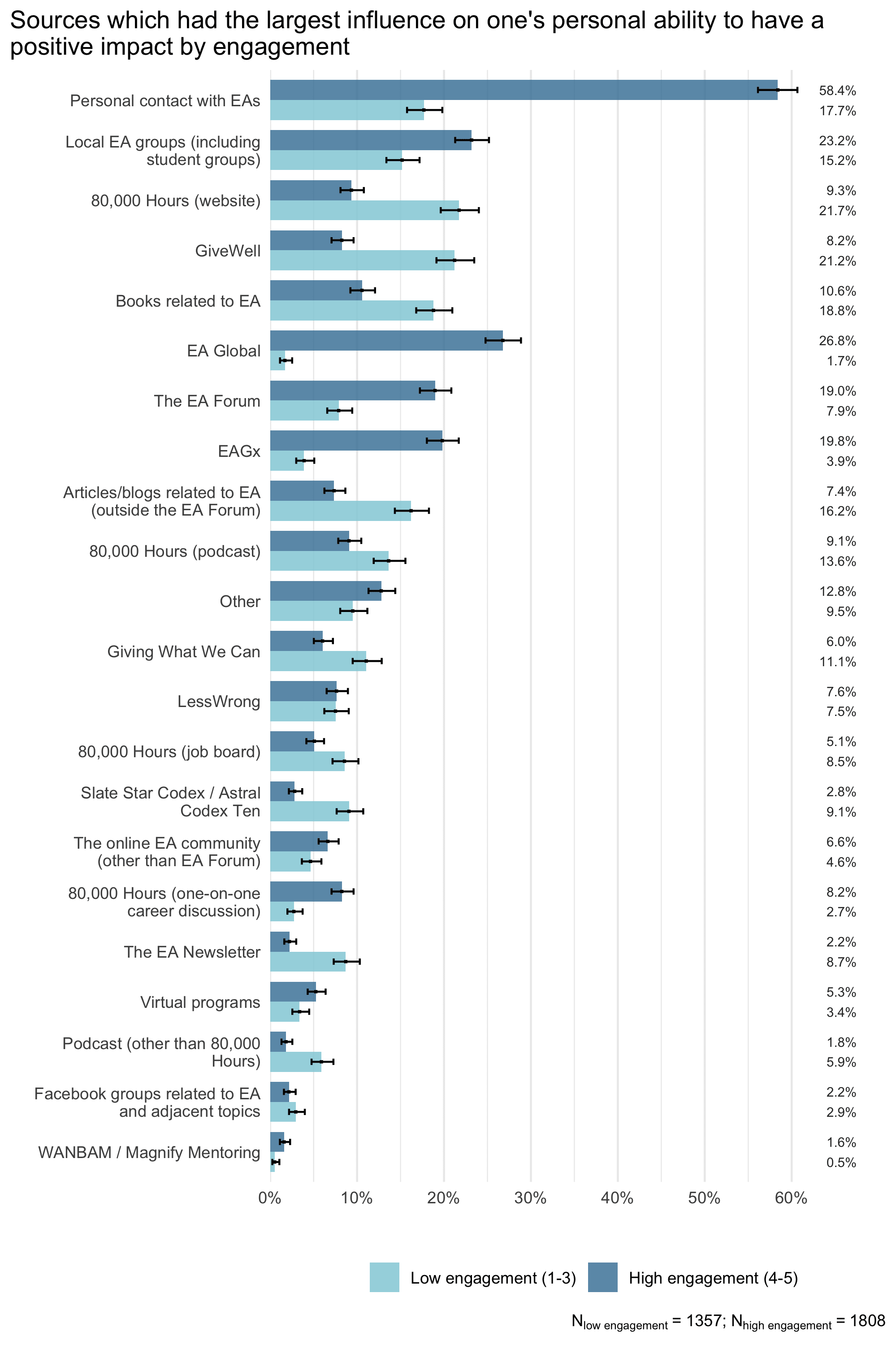 With this in mind, we found that high engagement respondents were more likely to select personal contact with EAs, local EA groups, EA Global, the EA Forum, EAGx, the online EA community, 80,000 Hours one-on-one career discussion, virtual programs, WANBAM/Magnify monitoring, and Other sources.
