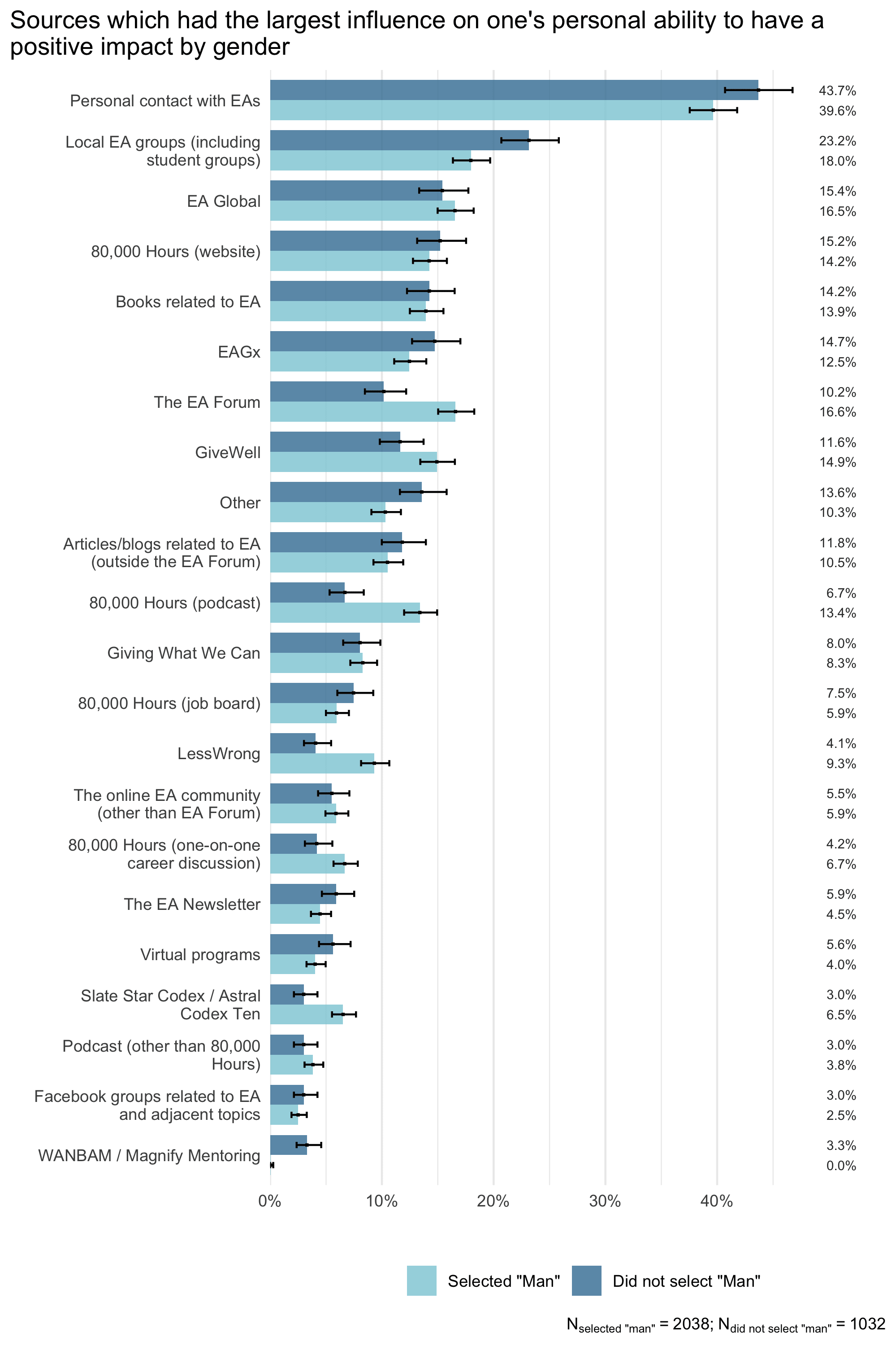 Respondents who indicated identifying as a man were more likely to select the EA Forum, GiveWell, the 80,000 Hours podcast and one-on-one career discussion, LessWrong, and Slate Star Codex/Astral Codex Ten as having the largest influence. Respondents who did not indicate identifying as a man were more likely to select local EA groups, WANBAM/Magnify Mentoring, and Other sources.