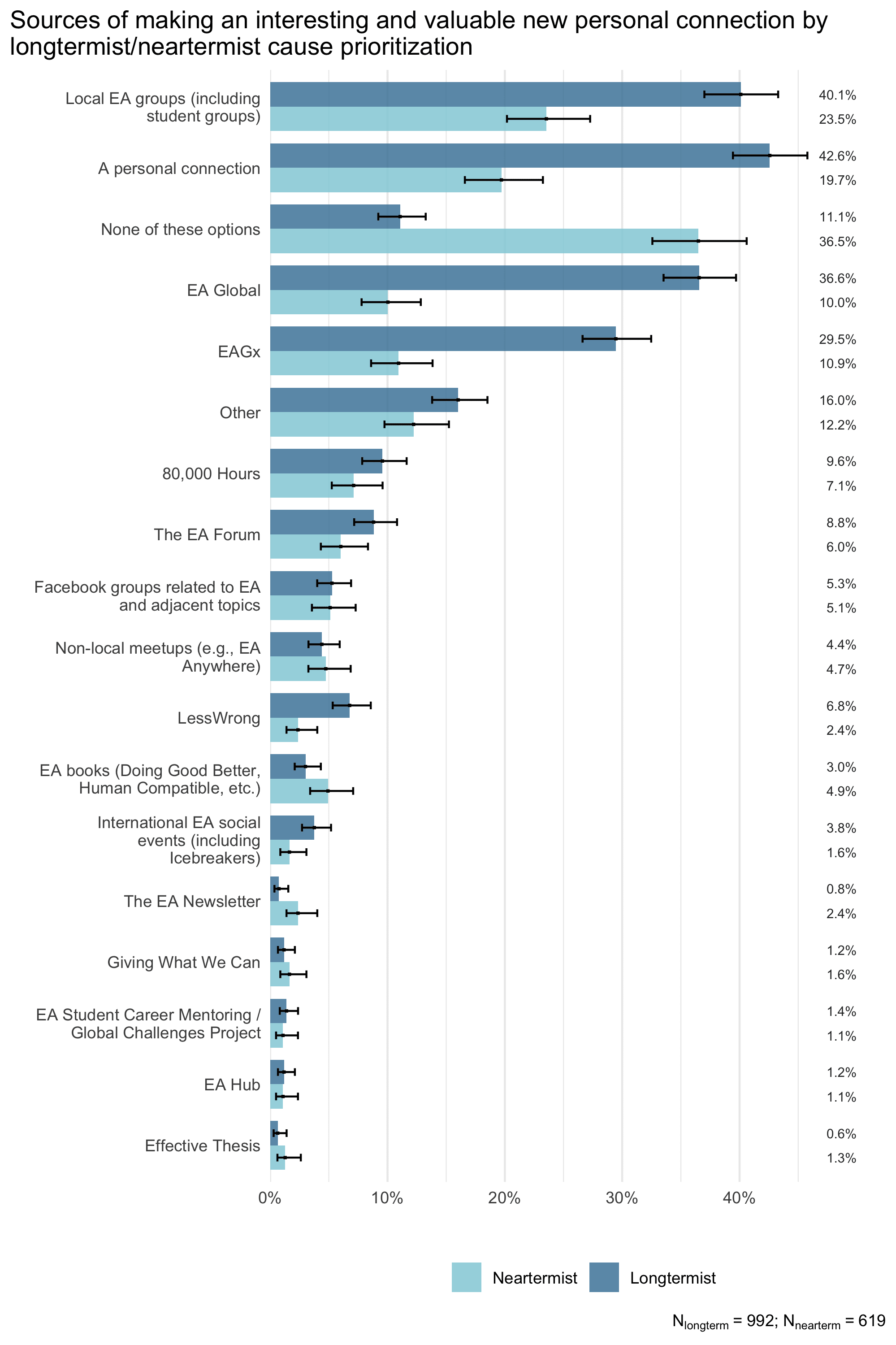 Below are the differences between neartermist and longtermist respondents regarding sources of making an interesting and valuable new personal connection. These differences also largely mimic the ones observed between low and highly engaged respondents. Longtermist respondents were more likely to select EA Global, a personal connection, EAGx, local EA groups, LessWrong, Other sources, the EA Forum, and international events. Neartermist respondents were more likely to select None of the options, EA books, and the EA Newsletter.