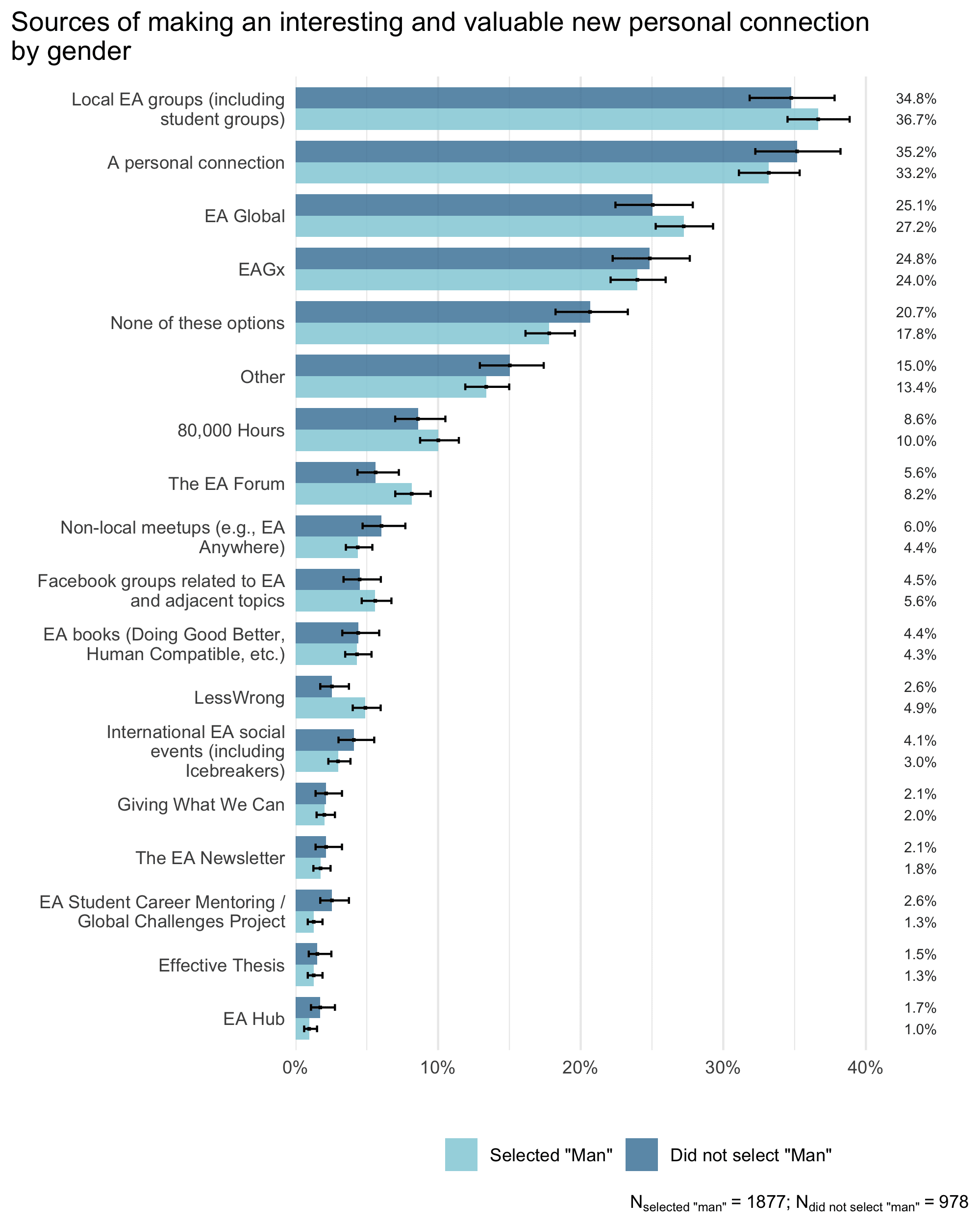 We generally did not observe many gender differences in sources for new connections, although we did find that respondents identifying as a man were more likely to select the EA Forum and LessWrong as a source, and less likely to select EA Student Career Mentoring/Global Challenges Project.