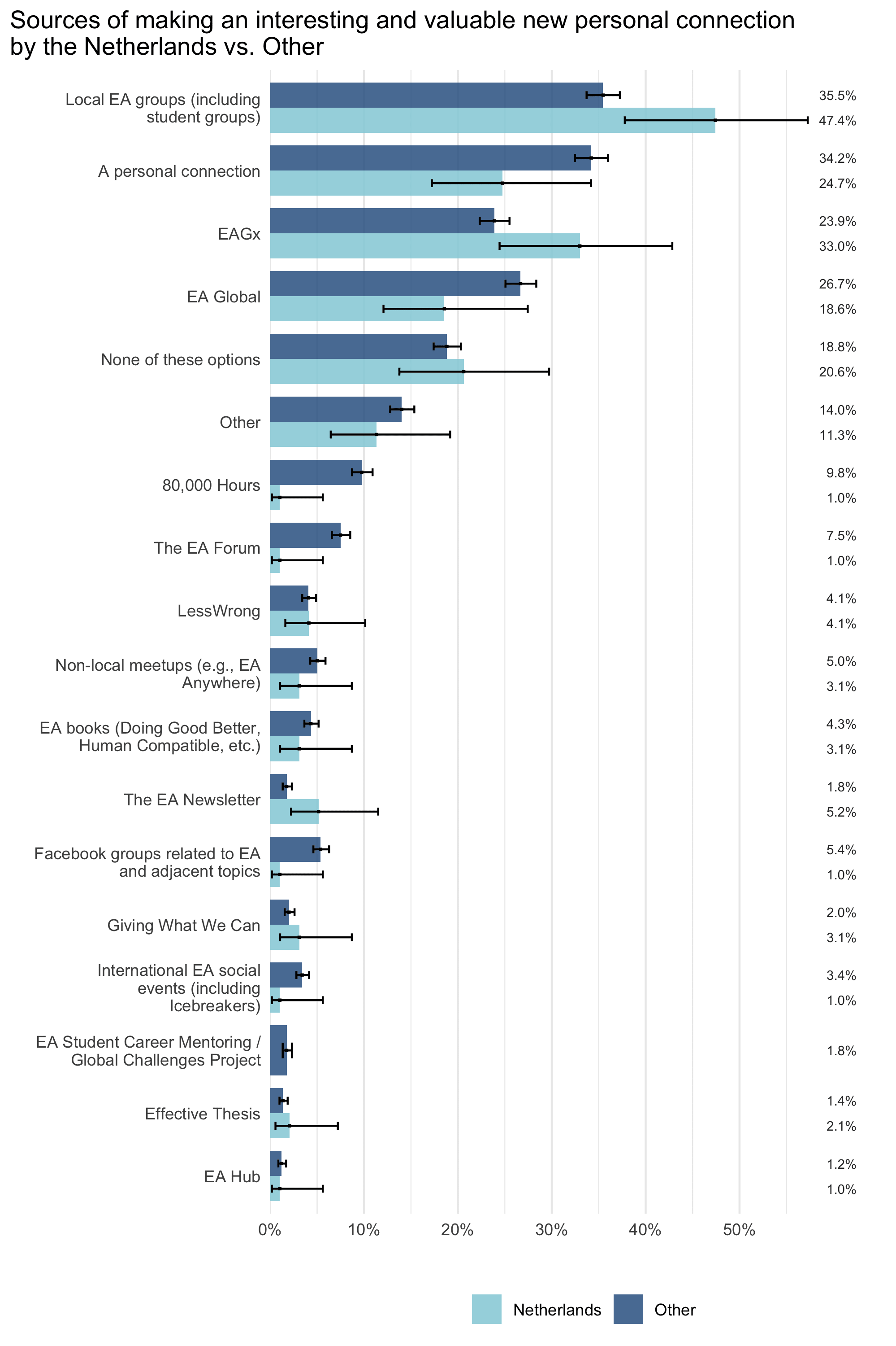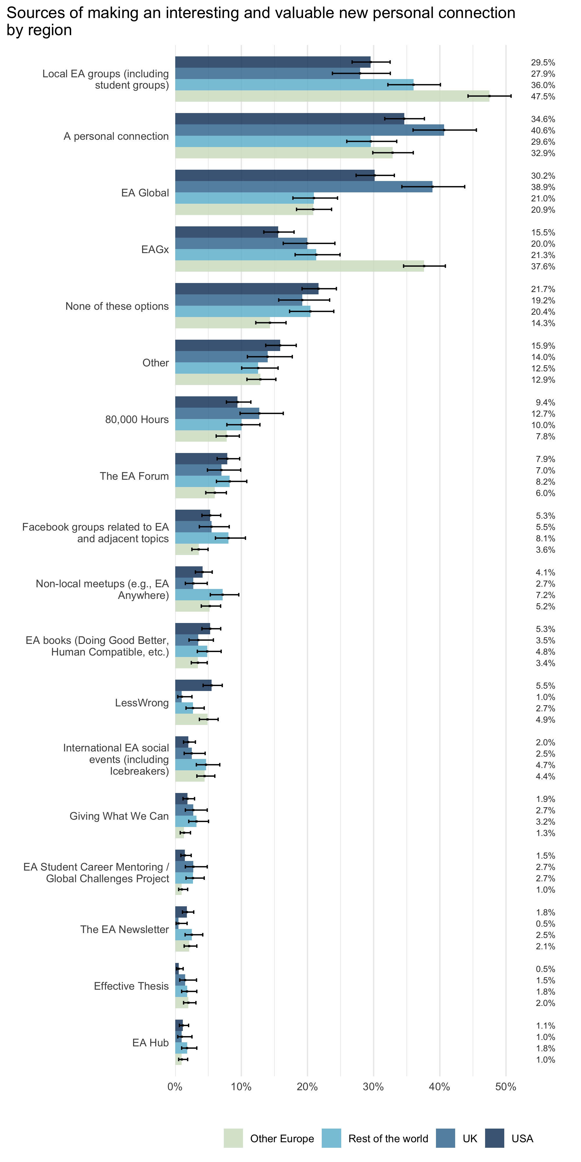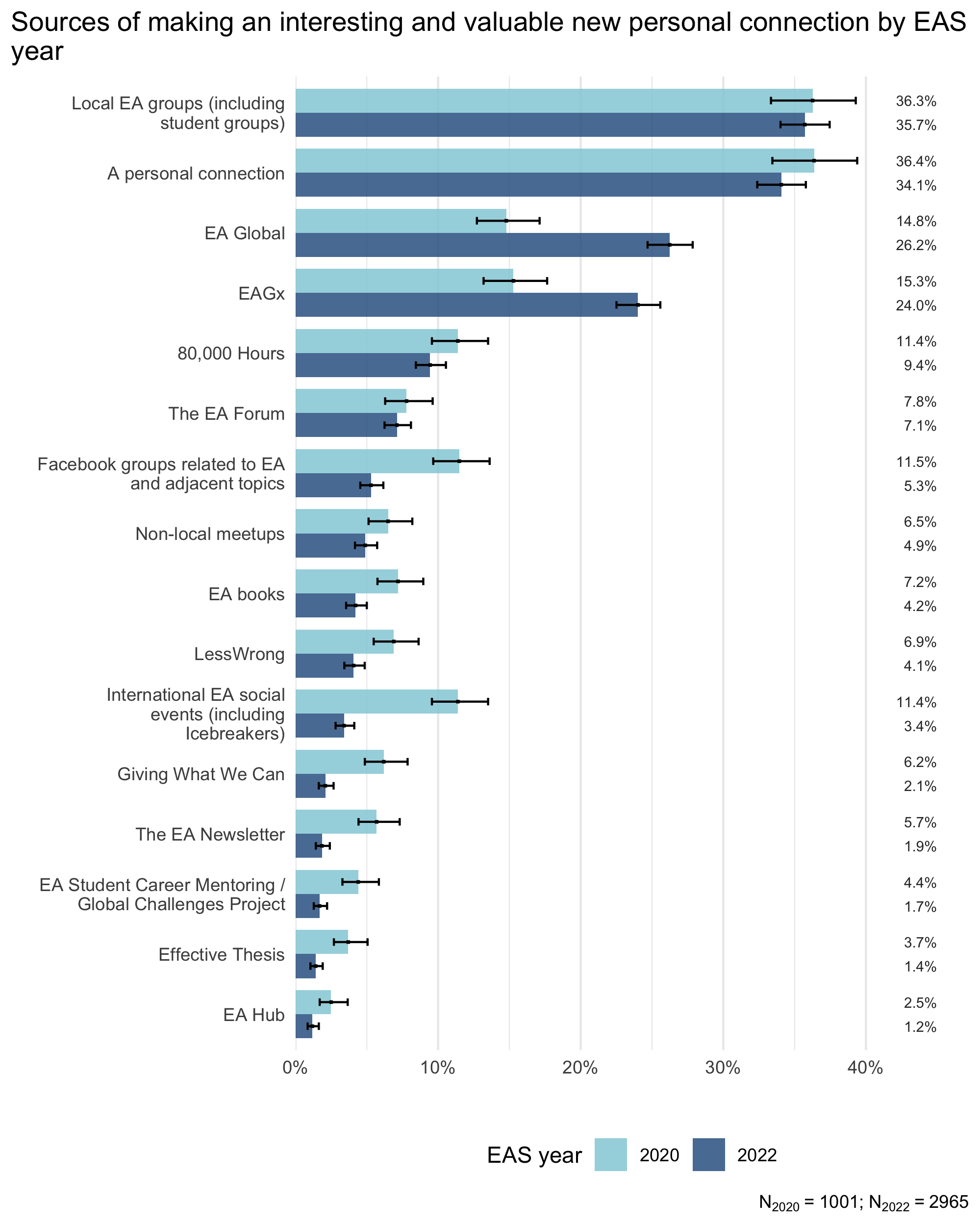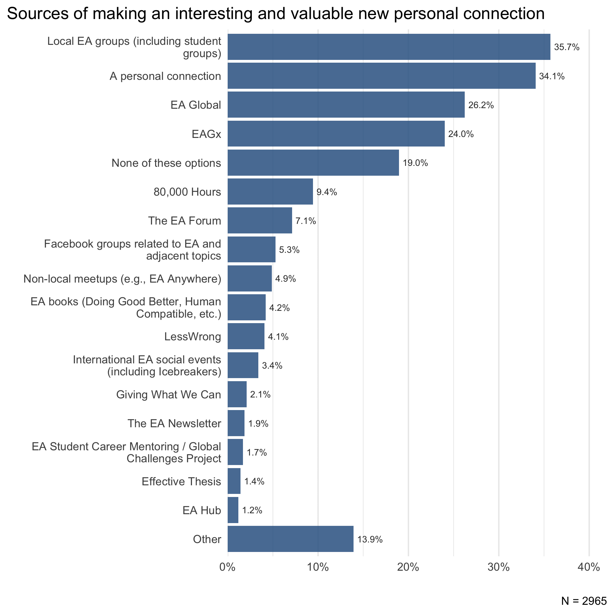 - Local EA groups were the most commonly cited source for making a new connection (35.5%), followed by a personal connection (34.1%), EA Global (26.2%), and EAGx (24.0%).
