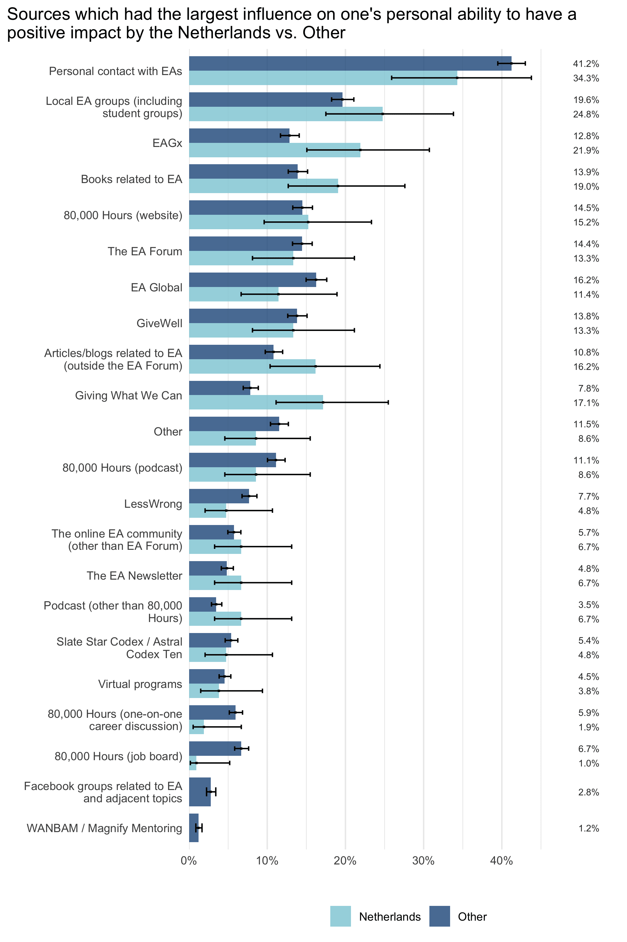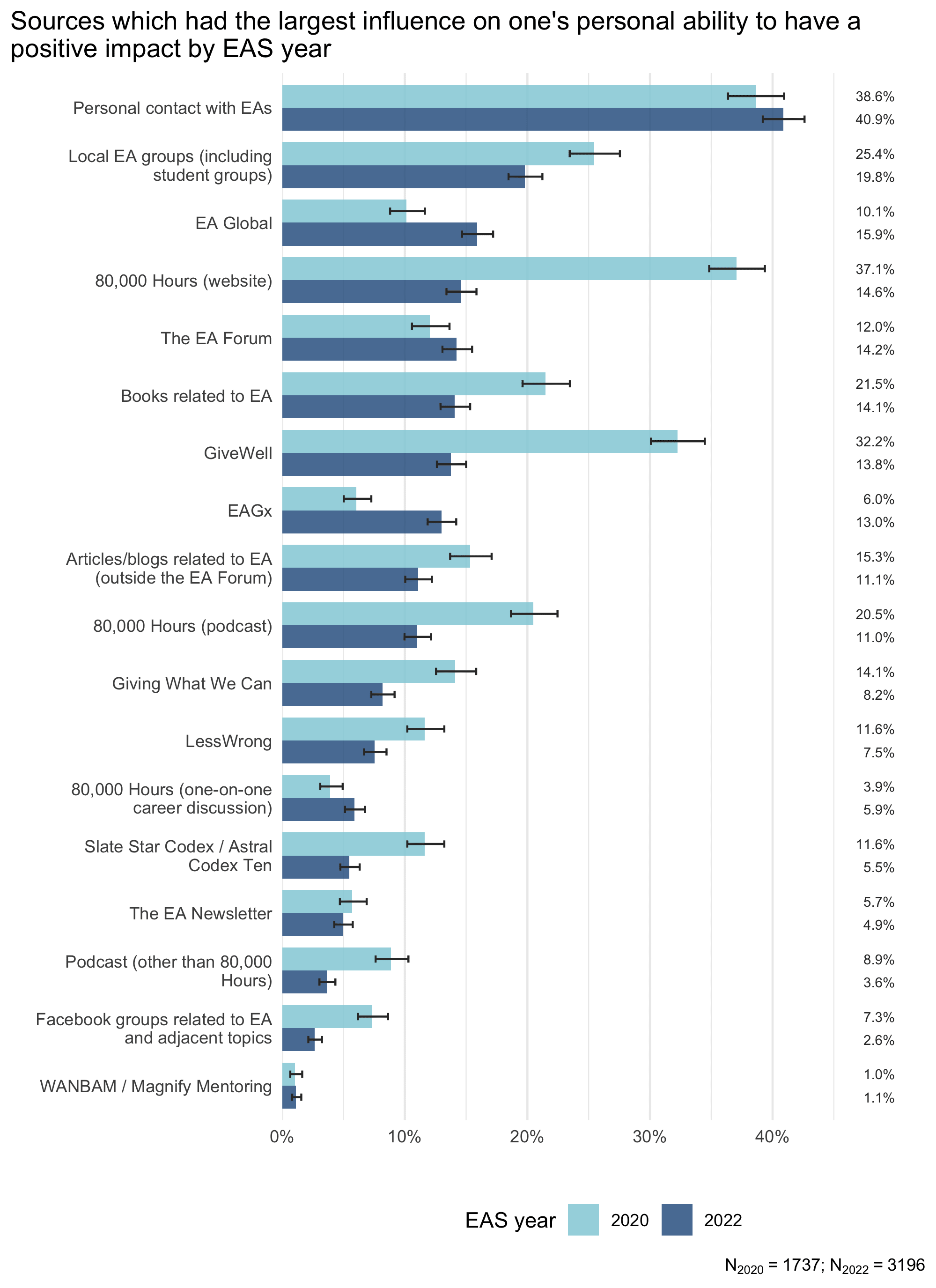 Compared to 2020, we see an increase in EA Global, the EA Forum, EAGx, and 80,000 Hours one-on-one career discussion as important sources for greater impact. These increases were quite small in most cases, with the biggest change observed for EAGx (from 6% to 13%). We saw multiple decreases, some quite sizable, in local EA groups, 80,000 Hours (both the website and podcast), Books, GiveWell, Articles/blogs, Giving What We Can, LessWrong, Slate Star Codex/Astral Codex Ten, podcasts, and Facebook groups.