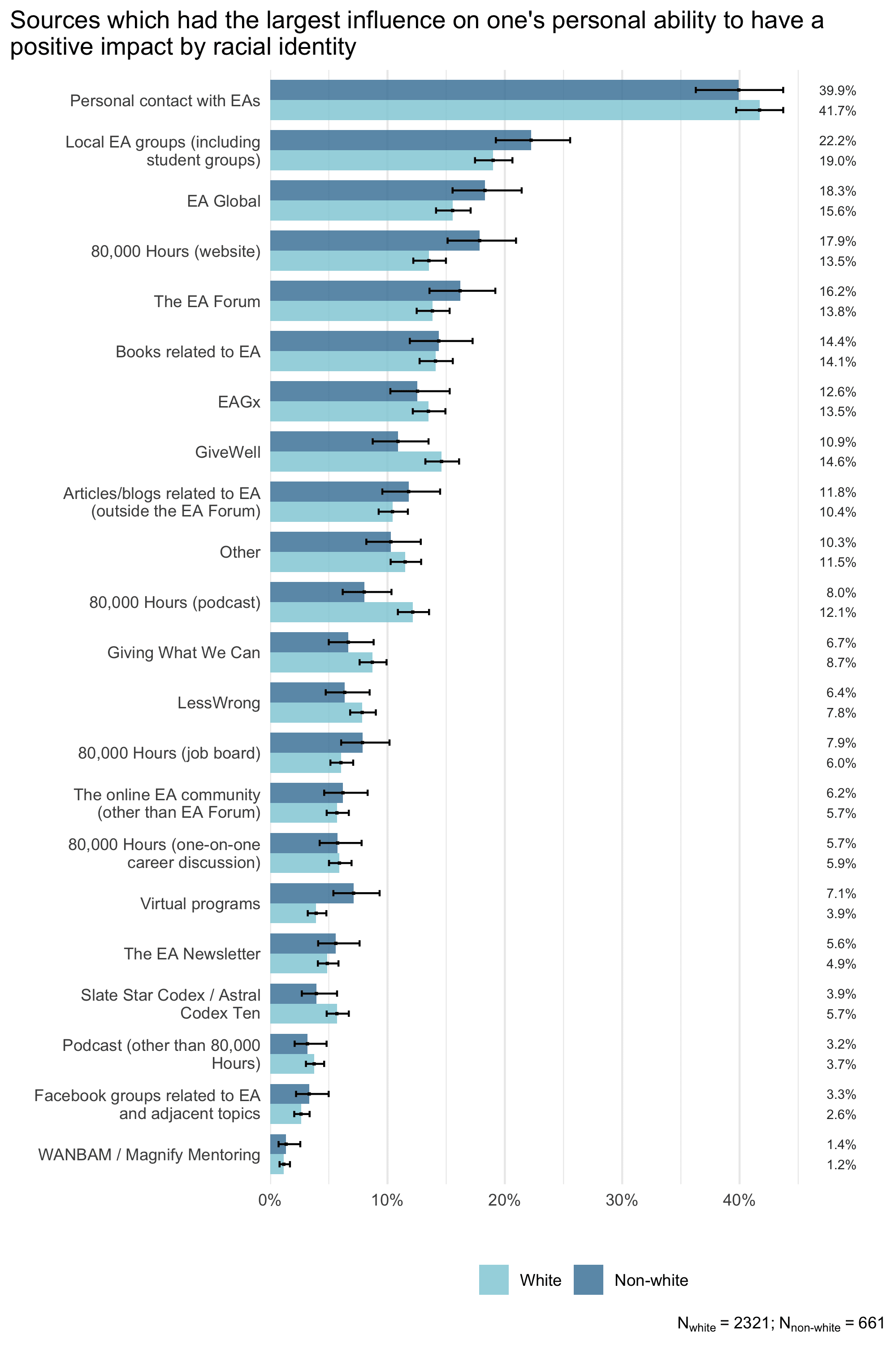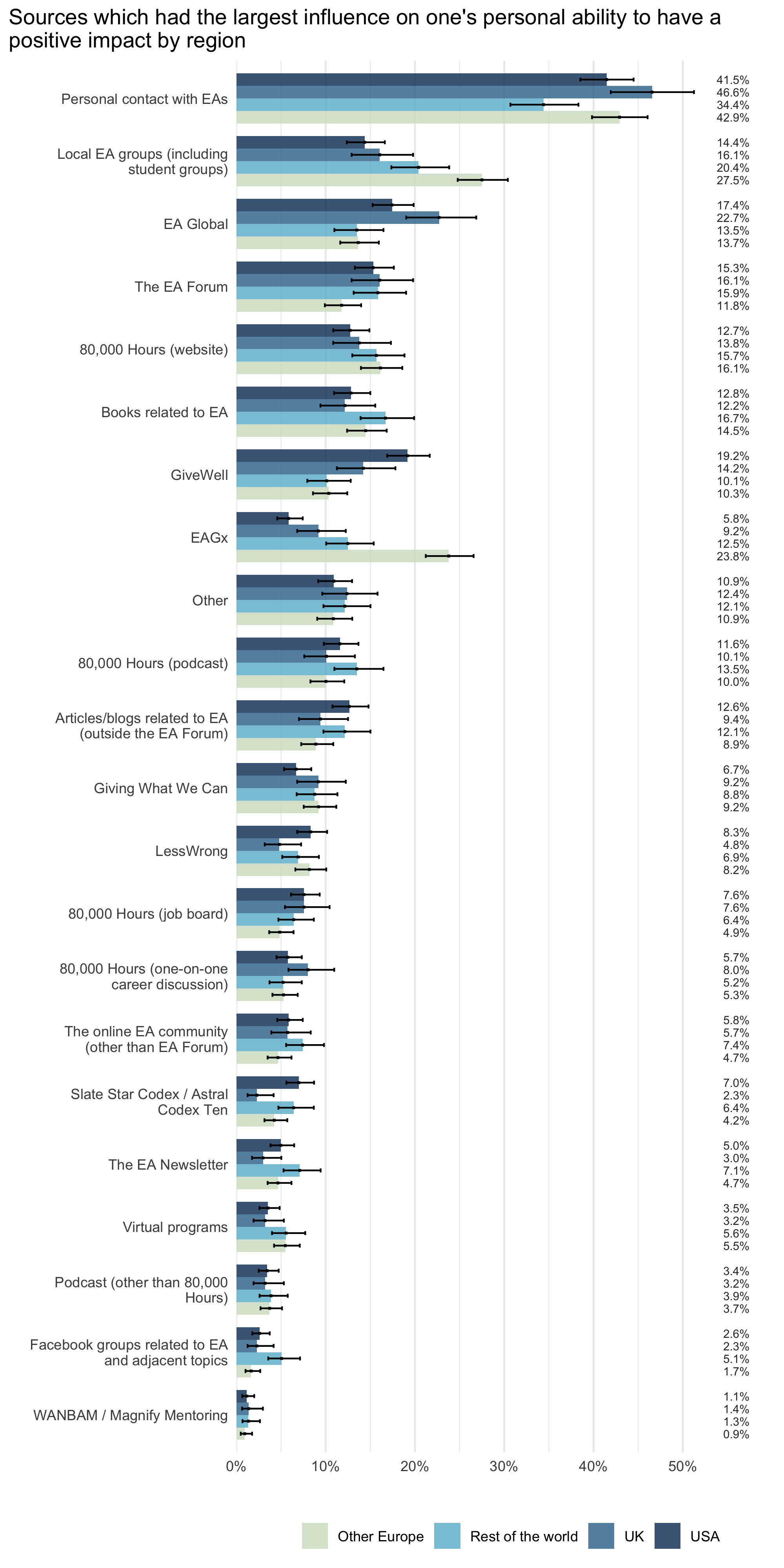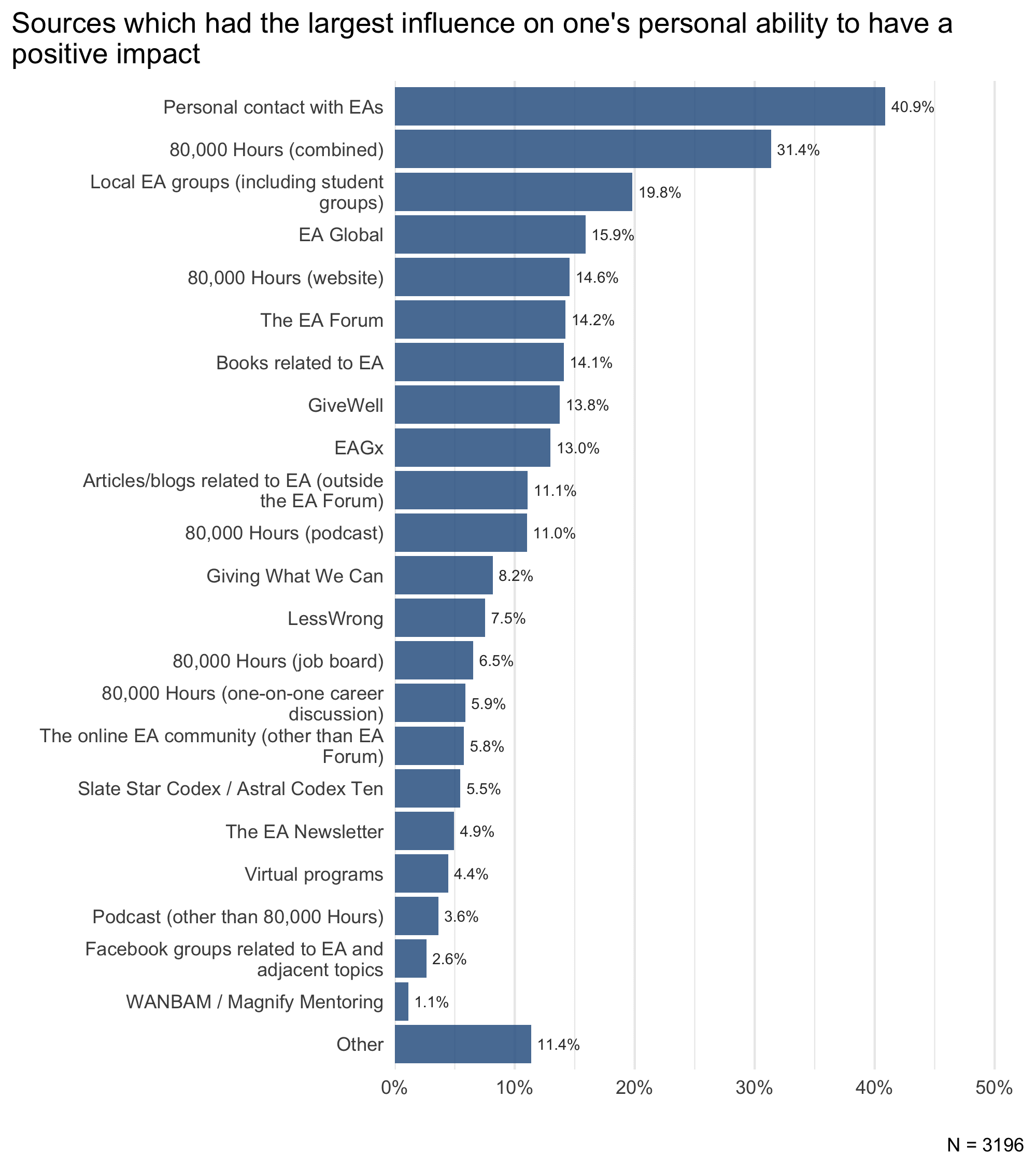 - Personal contact with EAs was the most commonly selected influence on EAs’ ability to have a positive impact (40.9%), followed by 80,000 Hours (31.4%) and local EA groups (19.8%).