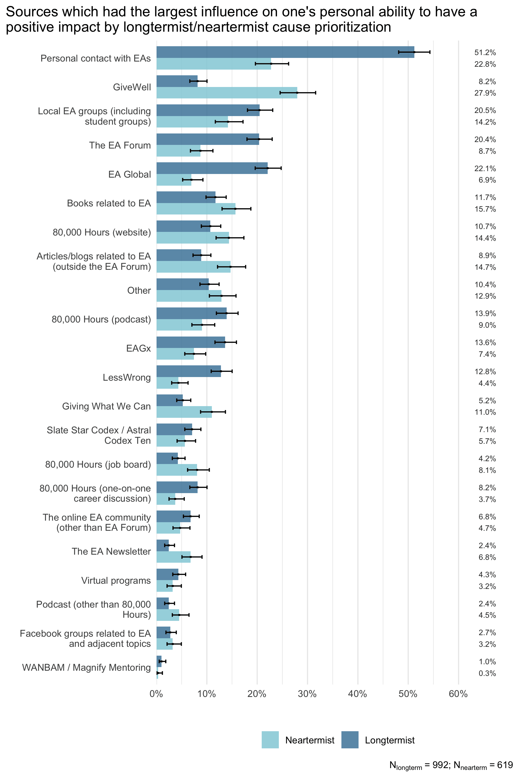 Regarding factors that had the largest influence on one’s personal ability to have a positive impact, we found that the differences were similar to the differences we observed between low and highly engaged respondents (which is to be expected, since highly engaged respondents are disproportionately longtermist). Longtermist respondents were more likely to select personal contact with EAs, EA Global, the EA Forum, LessWrong, local EA groups, EAGx, 80,000 Hours (podcast and one-on-one career discussion), and the online EA community than neartermist respondents. Neartermist respondents, on the other hand, were more likely to select GiveWell, Giving What We Can, articles/blogs related to EA, the EA Newsletter, 80,000 Hours job board, and podcasts.