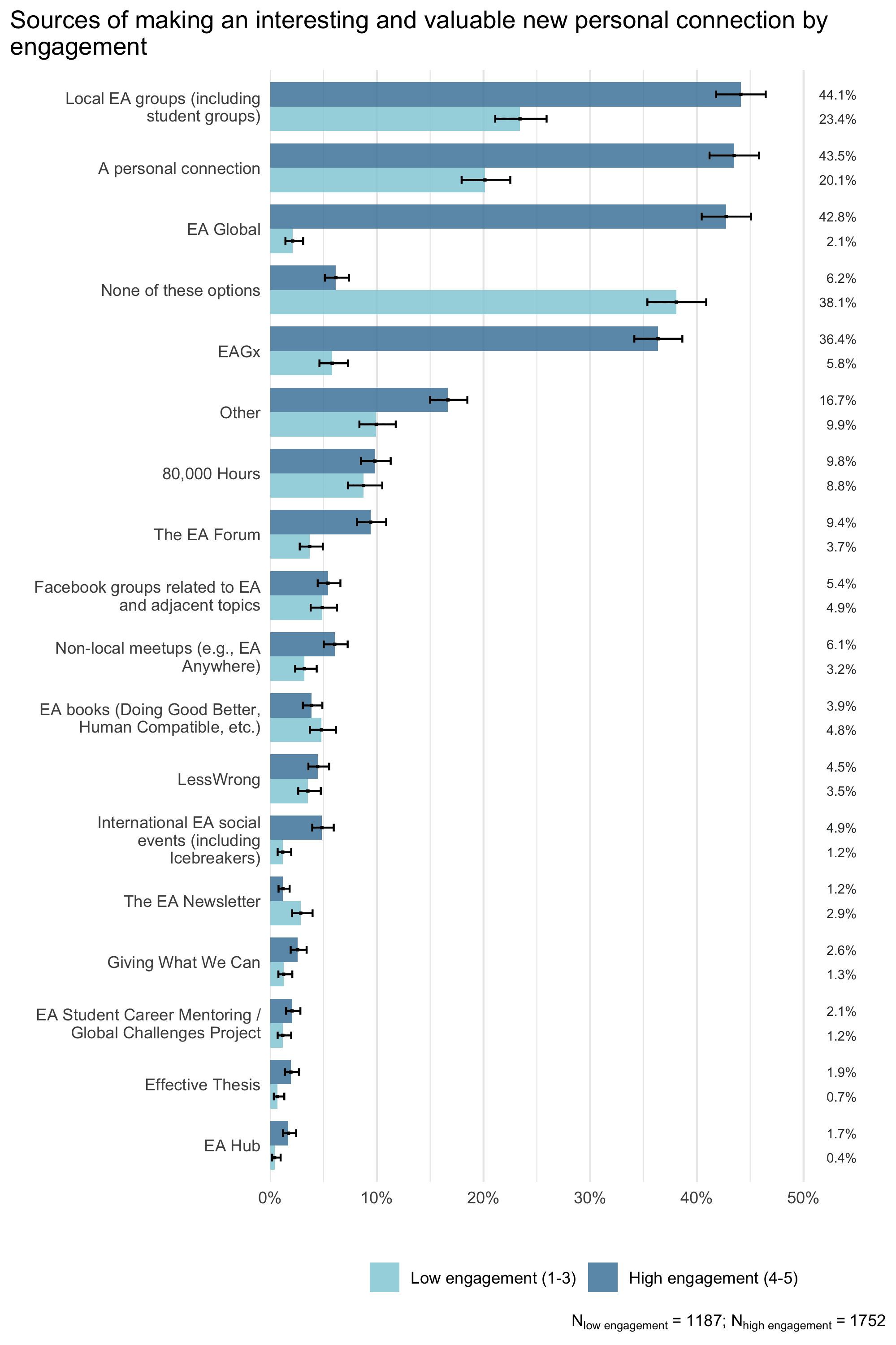 Highly engaged respondents were more likely to indicate making a new connection via EA Global, EAGx, a personal connection, local EA groups, Other sources, the EA Forum, international events, non-local groups, Giving What We Can, the EA Hub, and Effective Thesis. Less engaged respondents were more likely to select the EA Newsletter and None of these options.