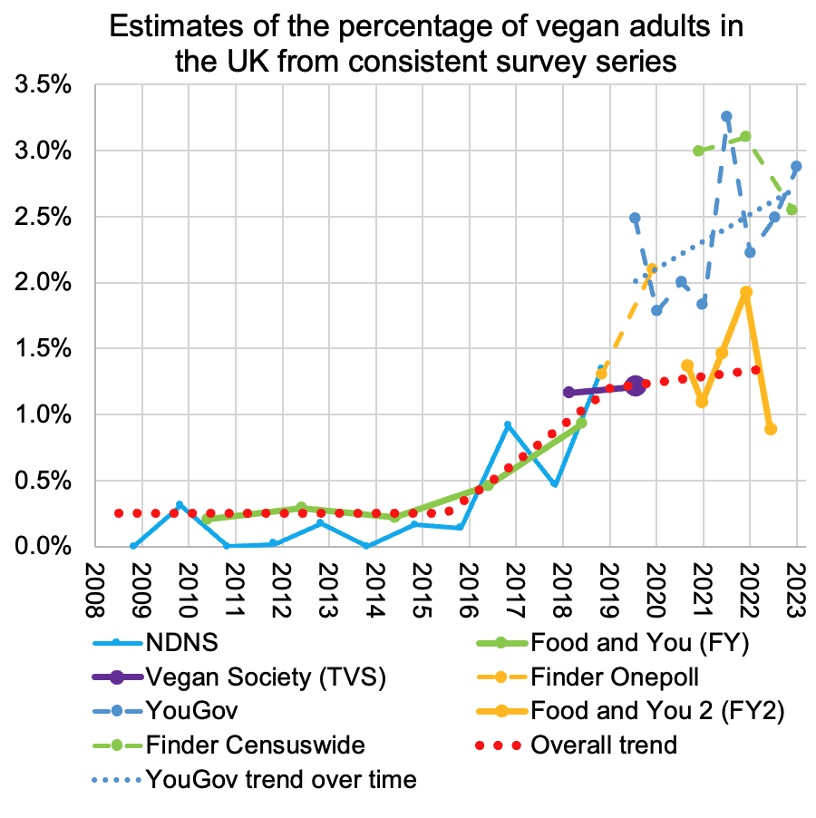 - I have copied below the chart summarising the results of different surveys offering a consistent time trend. The red dots denote Stephen's best guess of the underlying trend. I've also copied below the identification questions used in the Food and You Survey. The article contains links with further information about the surveys used in the chart.
