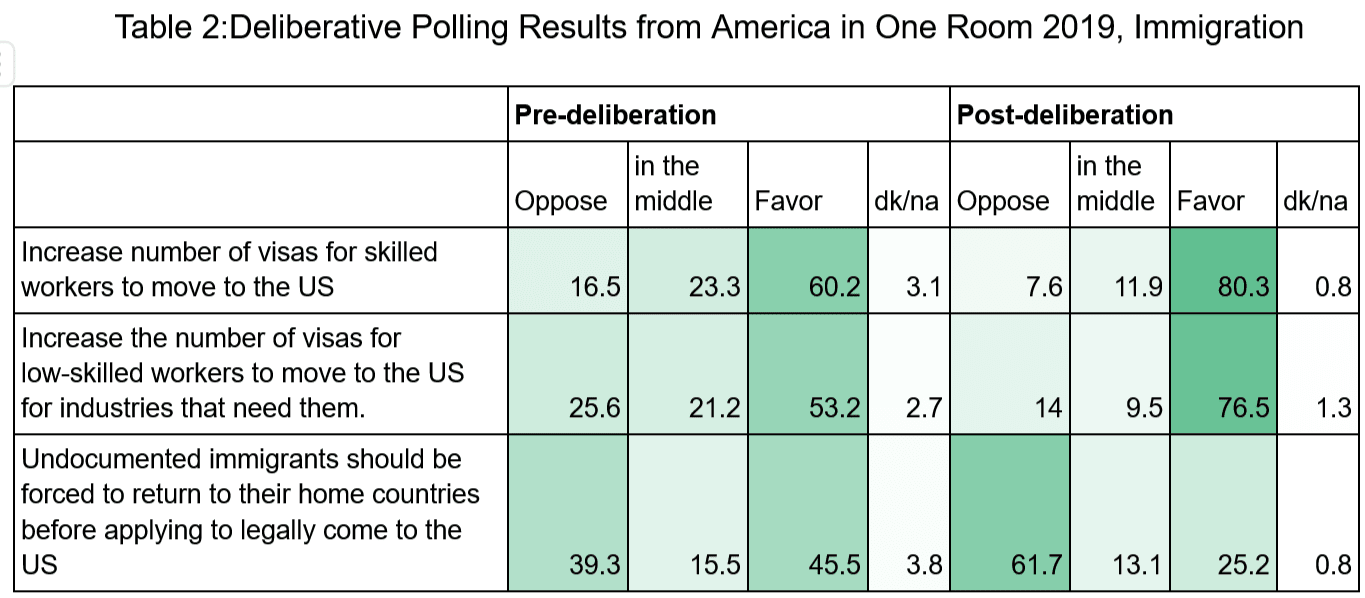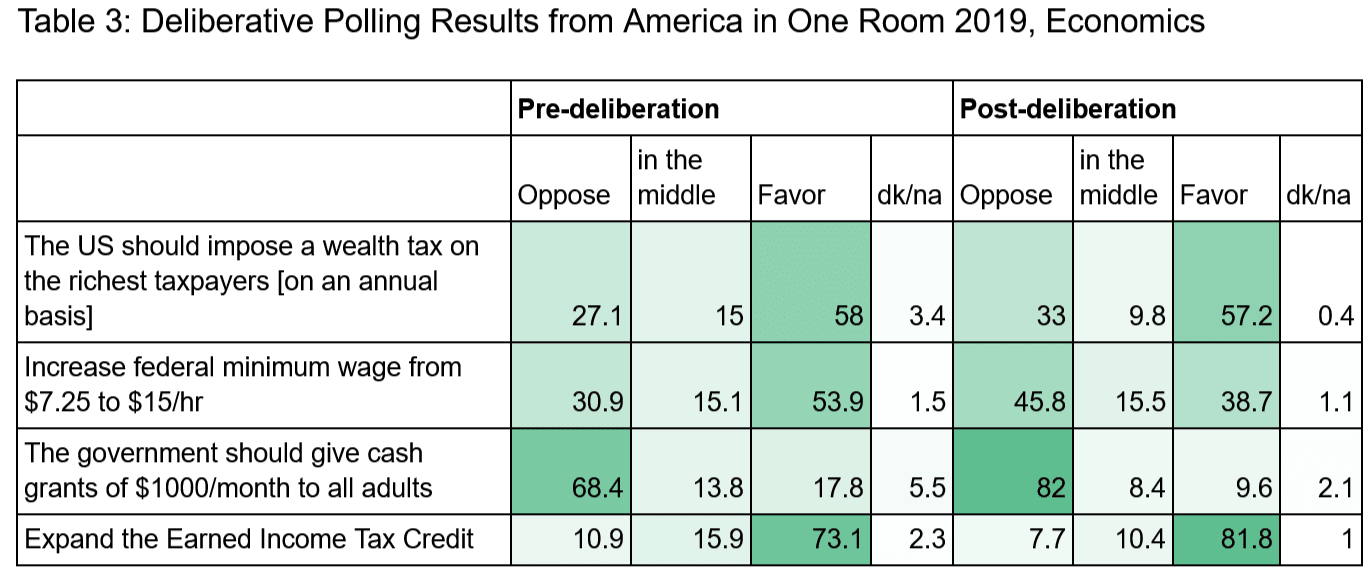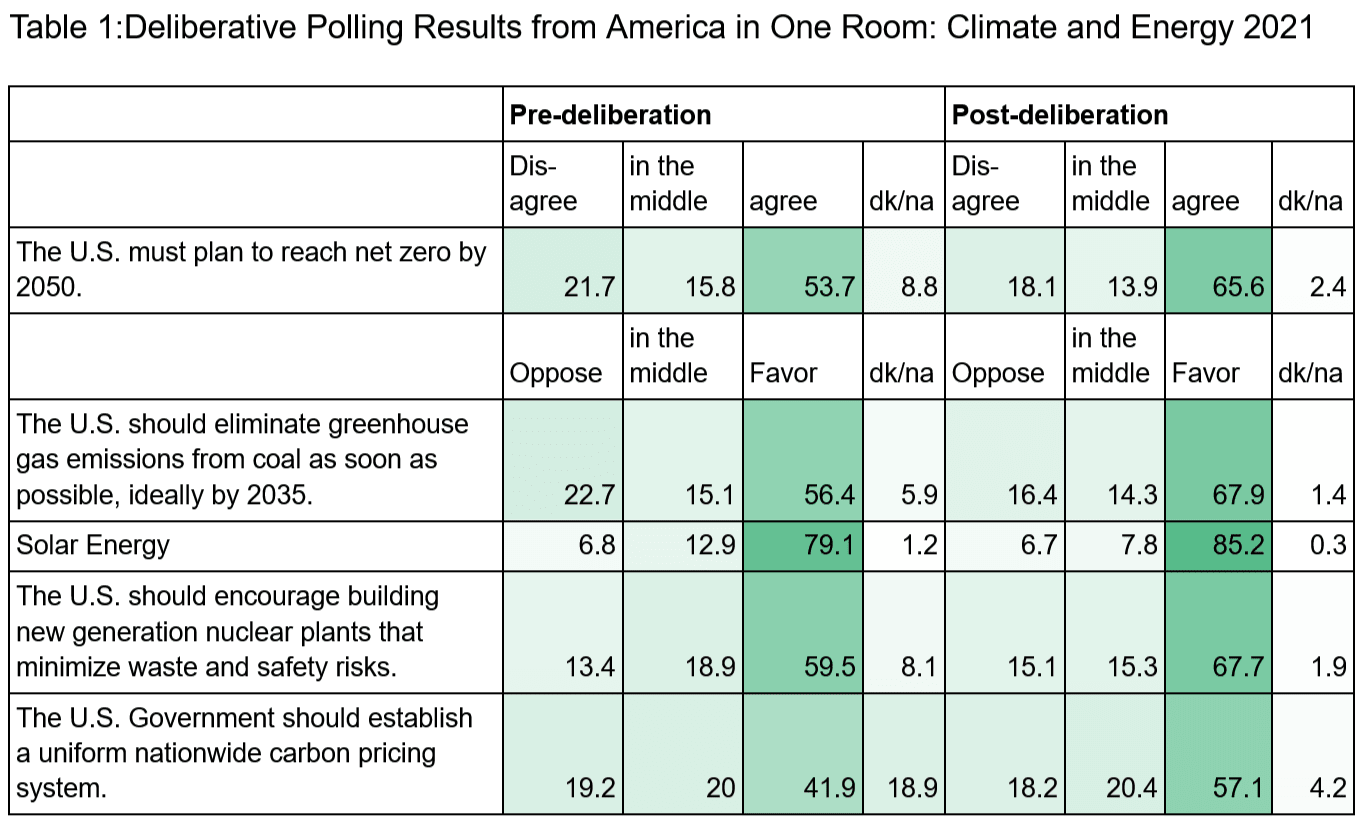 In terms of issues like climate change, the 2021 “America in One Room: Climate and Energy” deliberative poll found a 23-point increase from Texas residents in support for achieving net-zero after deliberation. Californians moved 15 points in support for building new-generation nuclear plants [5]. Participants also moved 15 points in favor of a carbon pricing system [6]. These changes in policy support were achieved in only 2-4 days of deliberation. Additional samples of deliberation results are shown in Table 1, 2, and 3.