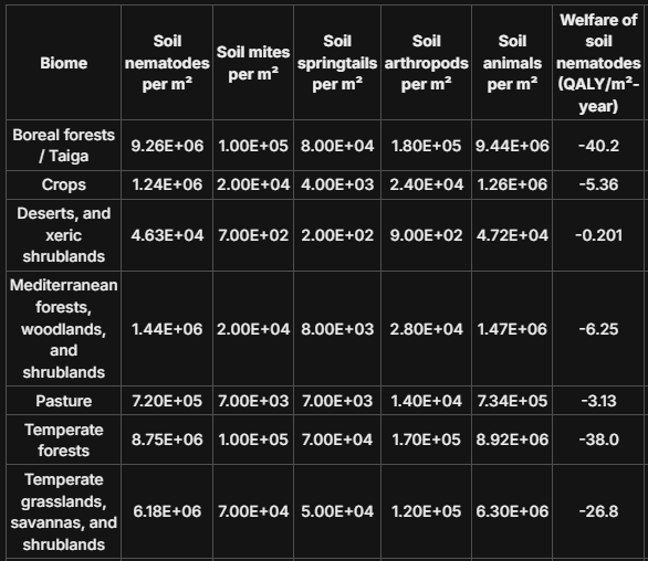 Reading through this interesting and provocative (though also IMO incorrect) post and some of your helpfully linked resources & further analysis, it's hard to wrap my mind around the worldview that must follow, once you believe that each random 1m^2 patch of boreal taiga, temperate grassland, and other assorted forest biomes (as you tabulate here; screenshot below), despite appearing to be an inert patch of dirt topped by a few shrubs or a tree, actually contains the moral equivalent of DOZENS of suffering humans (like 20 - 40 humans suffering 24/7 per cube of dirt)??