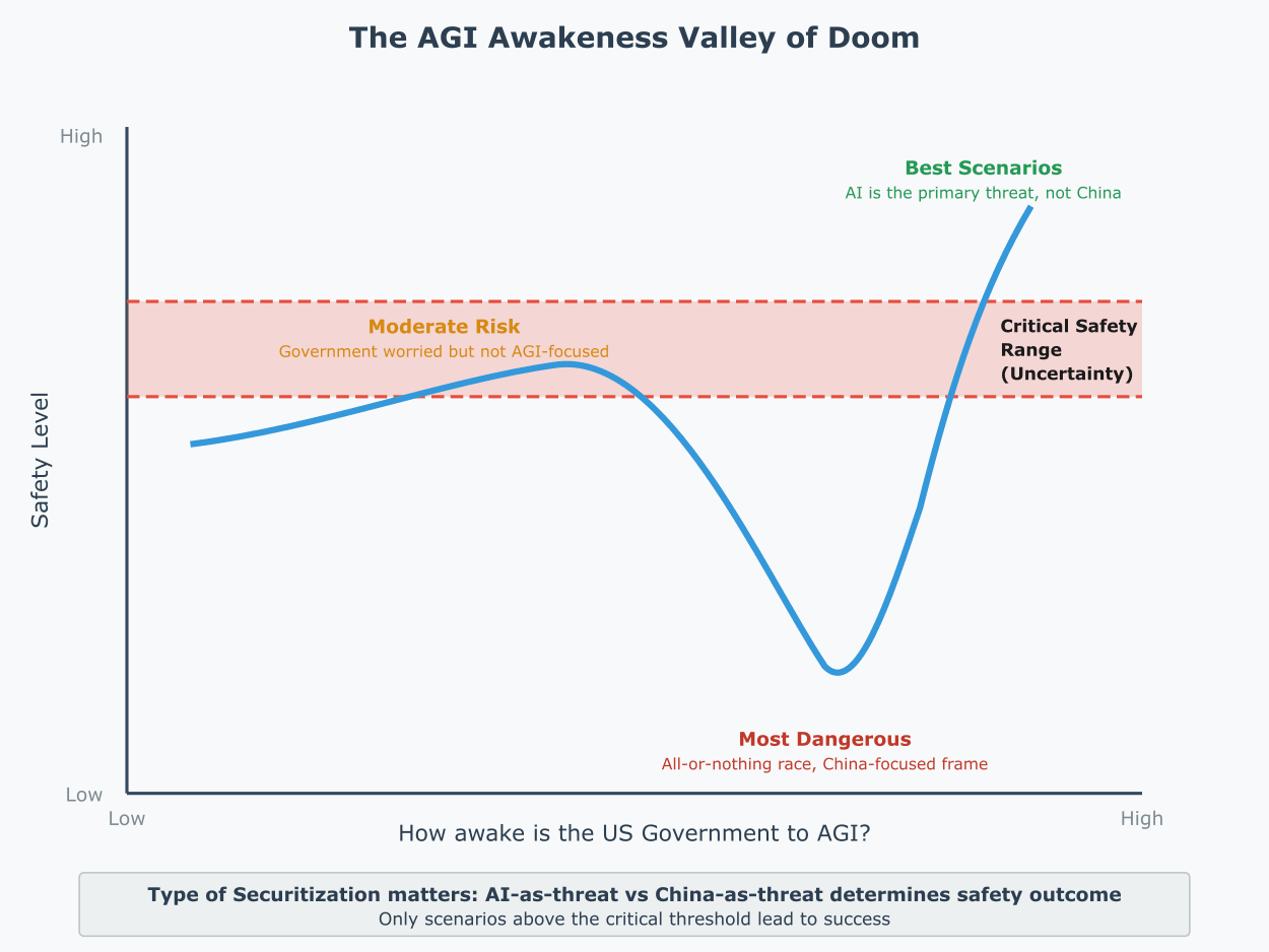 Figure 1: The AGI Awakeness Valley of Doom, showing the way that safety changes with degree of “awakeness” by the US Government. The Critical Safety Range is the range where the threshold dividing “future with existential catastrophe” to “future where we survive” lies, but we are uncertain over its position. Of course, this is in fact probabilistic - there are scenarios we end up in the valley of doom and survive.