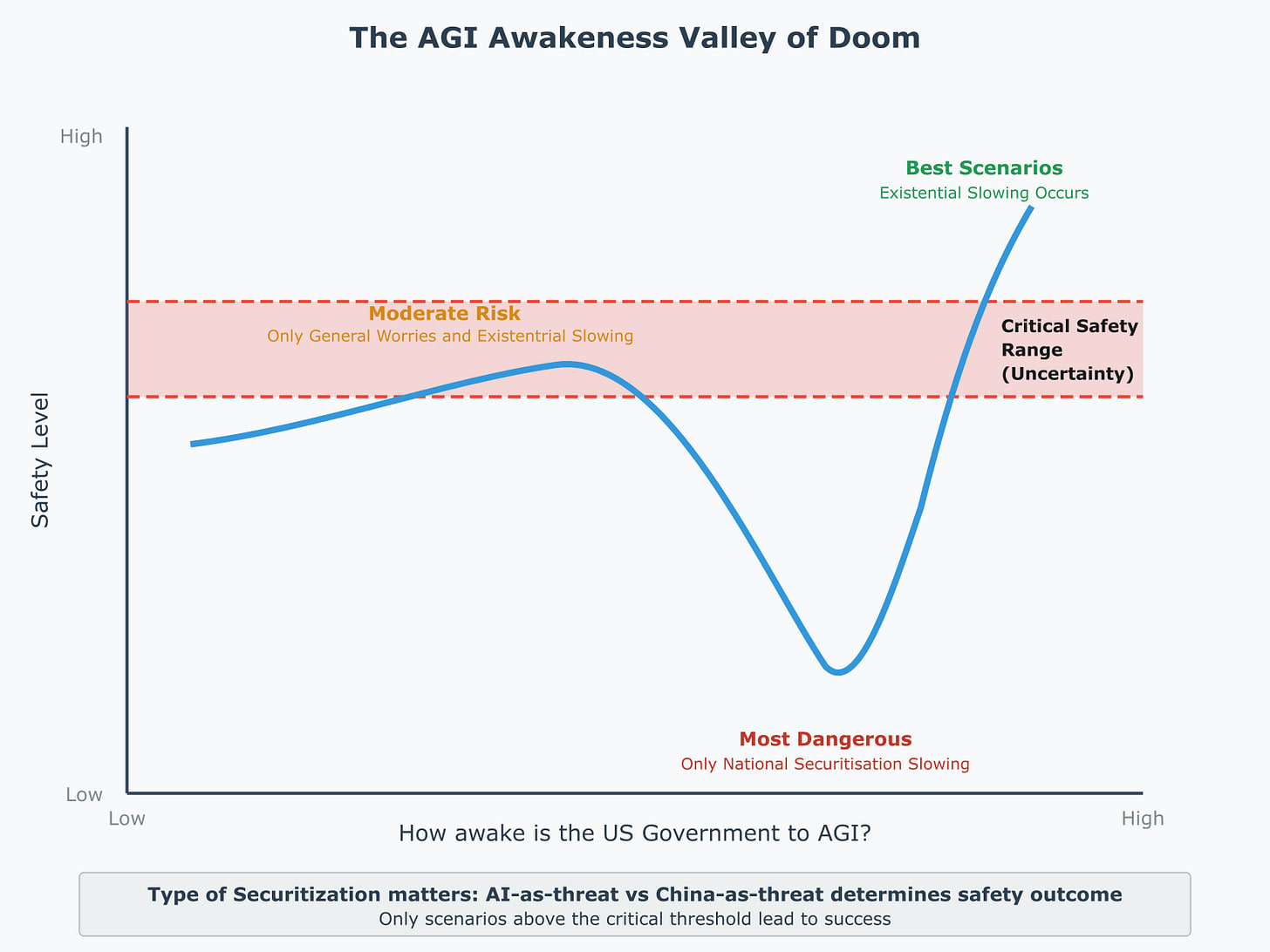 I think there is one critical dynamic to focus on here - what I call “The AGI Awakeness Valley of Doom”. When the government is not awake to the prospect of AGI and decisive strategic advantage, a “General Worries Slowing” can happen. It's also plausible that an “Existential Risk Slowing” can happen, if the strong national securitisation of AI is avoided. As the government becomes more aware of AGI and decisive strategic advantage, it plays strongly into an all or nothing race framing - strong national securitisation is favoured. The only scenario this leads to slowing is if the national security logic plays out in a way that favours slowing. In this “valley of doom”, only “National Security Slowing” can happen - and that's fragile. Finally, as the government becomes more aware of AI, and fully understands the threat, they end up leaving the valley of doom and moving to the best case actions.