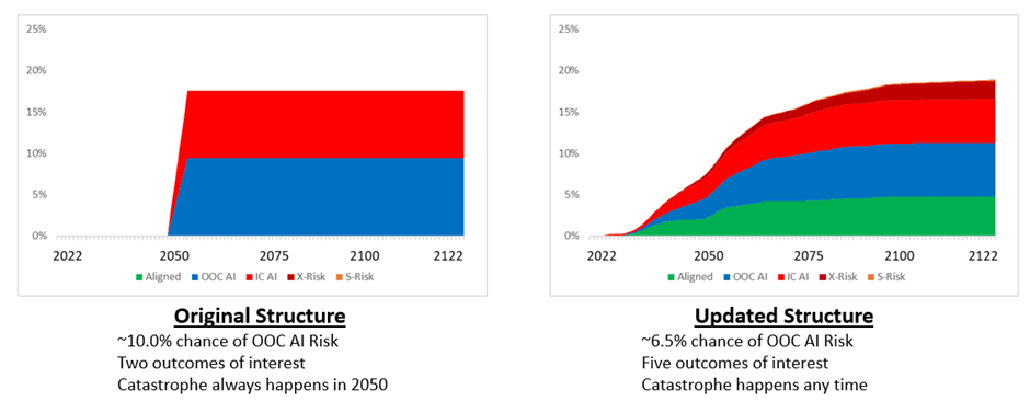 - The analysis underpinning this result is available in this spreadsheet. The results themselves are displayed below. They show that introducing time dependency into the model reduces the risk of OOC AI Catastrophe from 9.8% to 6.7%: