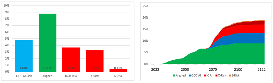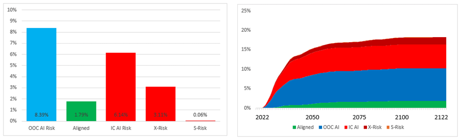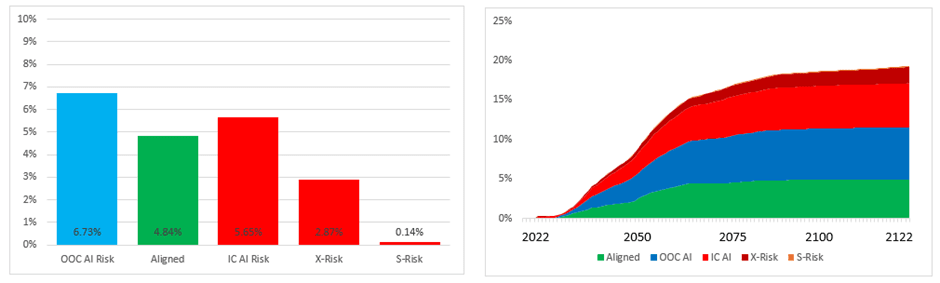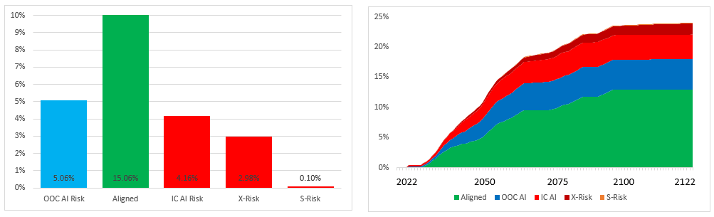 - IC AI Risk is a one-off risk which is tested for if AI causes a Catastrophe. It represents a Catastrophic event where an AI is deliberately used to cause a mass extinction (like X-Risk) or subjugate the population of the world (like S-Risk). Since Carlsmith does not distinguish between ‘in control’ and ‘out of control’ AI Risk this element is needed to avoid overestimating OOC AI Risk versus the Carlsmith model. Because it isn't time dependent it isn’t very interesting from a modelling perspective.