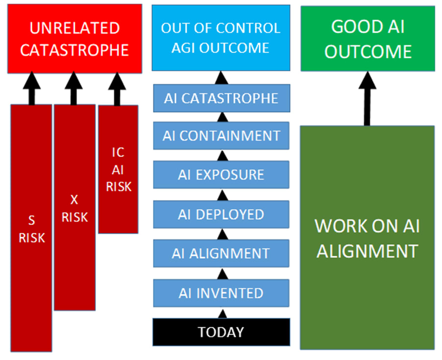 - S-Risk can occur any time from now until the end of the race, and represents – for example - a totalitarian government seizing control of the world to such an extent that human flourishing is permanently curtailed, but the development of AI is not (so S-Risk can occur before AI is Invented).