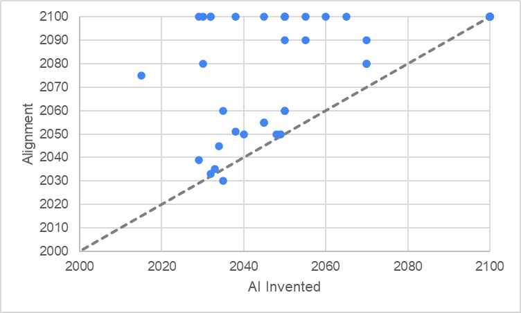 I hope these results have a ring of truth to them, because I think they reflect the uncertainty in the community survey quite accurately. The diagram below shows the community’s estimates for AI Invention timelines versus their estimates for AI Alignment timelines. The 45 degree line shows the cutoff where people believe that AI will be Aligned before it is Invented. Any datapoint at the far edge of the graph indicates that either the respondent gave a value that was too big to display or didn’t give a value and therefore is assumed to believe that AI cannot be Aligned (that is, either way they do not believe that AI will be Aligned before Invented). Only one brave iconoclast believes AI will be Aligned before it is Invented, which is why it might be surprising that adding in time dependency based on this survey makes any difference to the results.