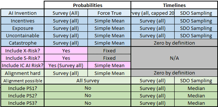 - PS1, PS2 and PS3 are my attempt to include some early thoughts about ‘partial successes’ in Alignment which are not as strict as the definition Carlsmith uses where Alignment reduces the risk of OOC AI to zero. I would describe my success here as ‘mixed’, so I have turned them all off for the base case.