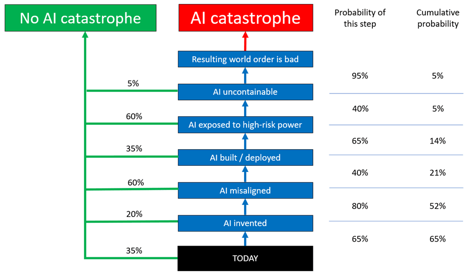 To an outsider, one of the most obvious ways this imbalance reveals itself is by looking at the difference in the number of approaches between modelling structural approaches and modelling parameterisation approaches. When looking at parameters there are a nearly endless number of methods represented – biological anchors, expert survey, prediction markets, historical discontinuity approaches and probably a load I’ve missed because I’m not an expert in the field. However, by contrast there is – from what I can tell from my review – exactly one published structural model of AI Risk, Carlsmith (2021). This structure is replicated below. In lay terms we might think of the structure of the model as operating by describing a number of weighted coinflips which can come up ‘good’ or ‘bad’. If all of these coinflips come up ‘bad’ then we have a Catastrophe. In this sort of model, the overall risk of Catastrophe is simply the probability of each of these individual steps multiplied together. Although only Carlsmith has extensively specified his model, you can see that this sort of ‘weighted coinflip’ approach is motivating other qualitative discussions of AI Risk structures (e.g. here).