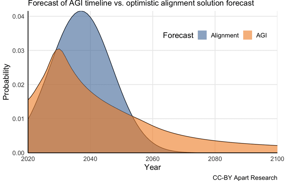 I am not an AI Risk expert so to avoid making an embarrassing error I am going to identify an assumption where the expert-level thinking has already been done for me by Apart Research, and I can focus entirely on modelling out the implications. Specifically, I am going to trace out the implications of uncertainty existing in the timelines for AI Alignment, and therefore the implication that we don’t have perfect knowledge of whether Alignment will come before Catastrophe. The motivation for this approach described in this post (and summarised very nicely by the diagram below).