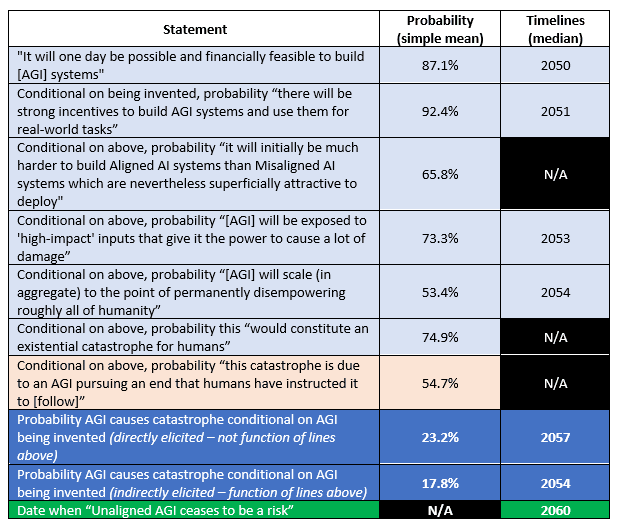 I got a bit anxious at the thought of presenting these alongside the main results because I think I've done a fairly good job of only talking about things I understand properly in the main body of the text, and I don't understand the nuts-and-bolts elements of Alignment at all well. But I thought people might be interested to see this even if it isn't perfect, if only to prove my point that there’s probably another halving of risk available to the first team who can present a plausible account of how a ‘multi-step’ model of alignment could work.