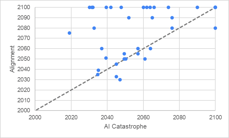 - Some people did not give a date for when they thought Alignment would occur, which I interpreted as meaning they did not think it would ever be possible (backed up by reading some of their comments on their entries). I added a bit of an ad hoc term to make Alignment literally impossible in those worlds, so the only possible outcome is some sort of Catastrophe. If I ran the survey again, I would explicitly ask about this.
