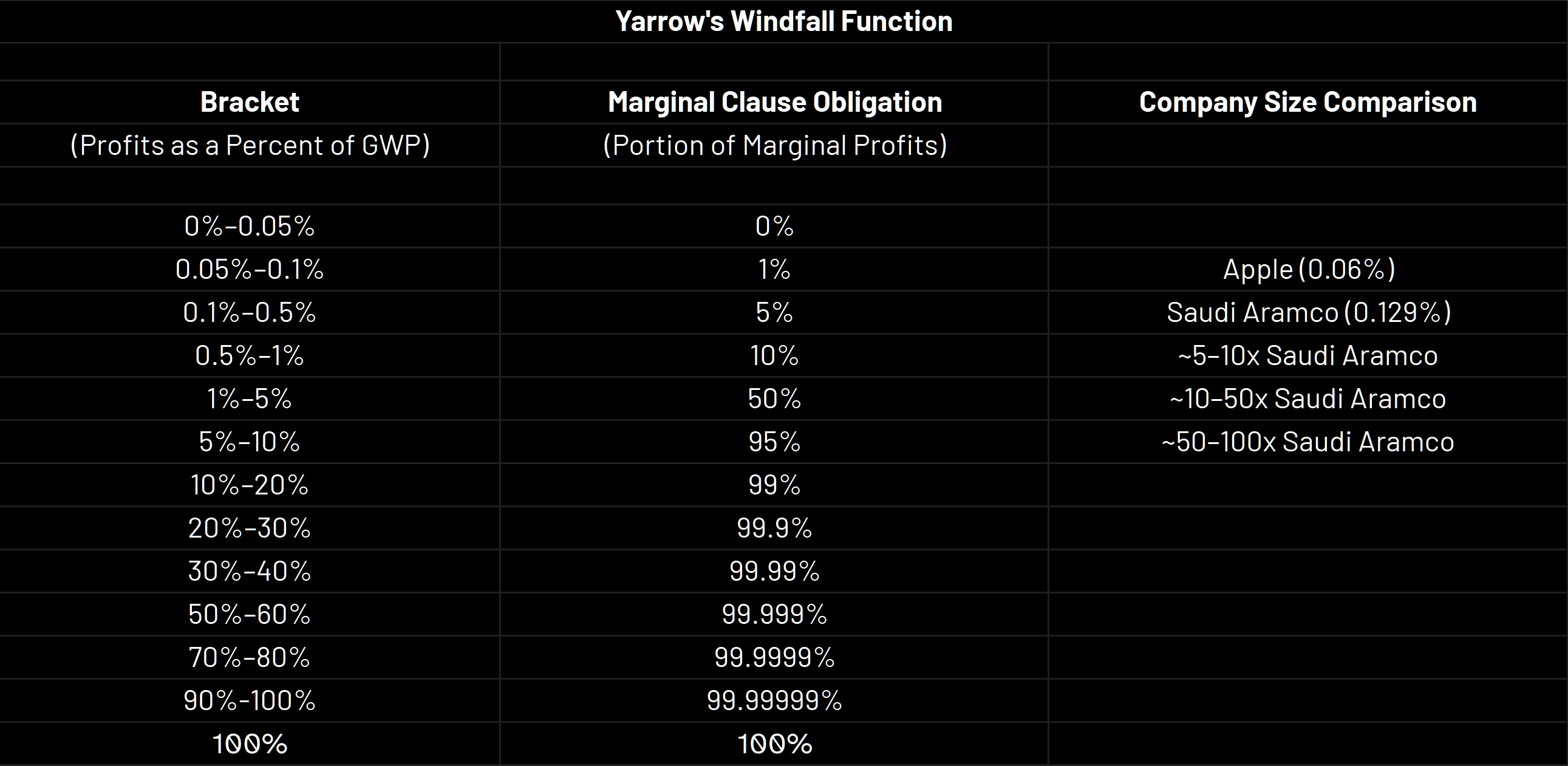 The term “windfall” comes from the fact that this threshold only occurs if a company receives “windfall” profits, meaning an unexpectedly large amount of profits. The clause acts a pledge that companies make before actually reaching this “windfall” threshold for donating. The low likelihood of reaching the threshold along with the preemptive nature of the pledge helps increase the likelihood of companies actually choosing to take the pledge.