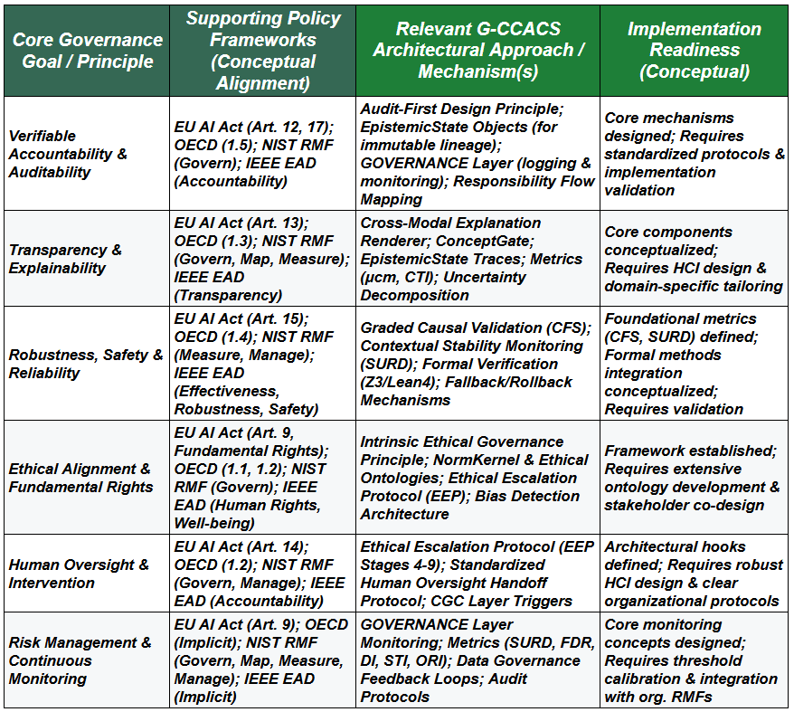 High-level principles for trustworthy AI, as articulated in frameworks like the EU AI Act or OECD Principles, are essential starting points. However, the critical challenge lies in translating these principles into tangible technical reality — building systems where compliance is verifiable and governance is operational. Architectural blueprints like G-CCACS offer a vital link, demonstrating how abstract goals like accountability, transparency, and ethical alignment can be realized through concrete design patterns, specific mechanisms, and measurable indicators.
