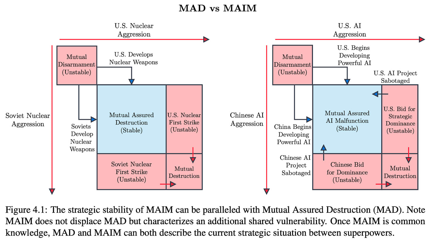 This dynamic mirrors Mutual Assured Destruction (MAD) from the nuclear strategy, in which no state attempts a first strike for fear of retaliation. In the context of AI, the authors of the paper propose a deterrence regime they call Mutual Assured AI Malfunction (MAIM). If a state attempts a bid for AI dominance, it risks triggering a response from its competitors.