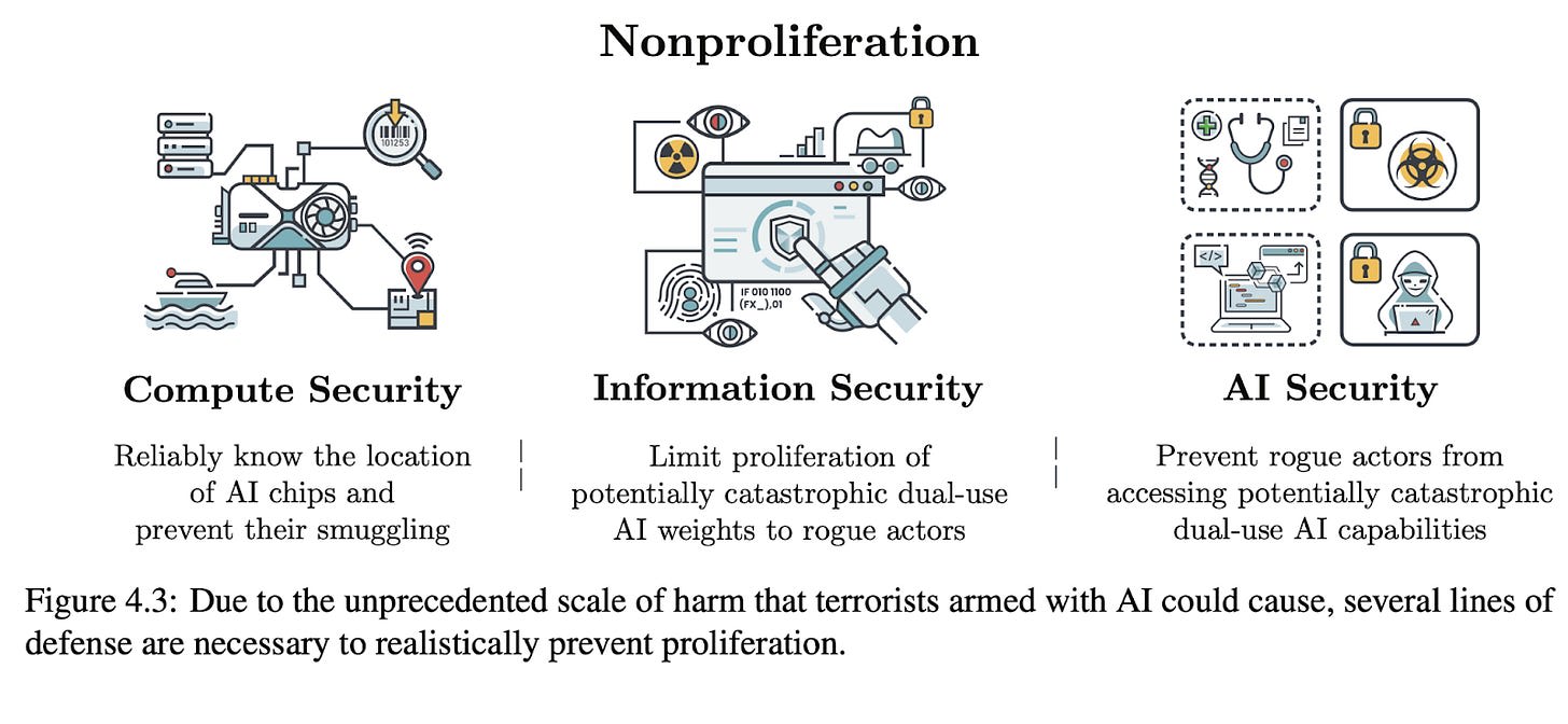 Deterrence may constrain state actors, but ensuring national security also requires limiting the proliferation of AI capabilities to terrorist groups and non-state actors. Advanced AI systems could be weaponized by nonstate actors to engineer bioweapons and conduct cyberattacks. Drawing from past nonproliferation efforts for weapons of mass destruction (WMDs), the paper outlines three key measures to prevent AI misuse: