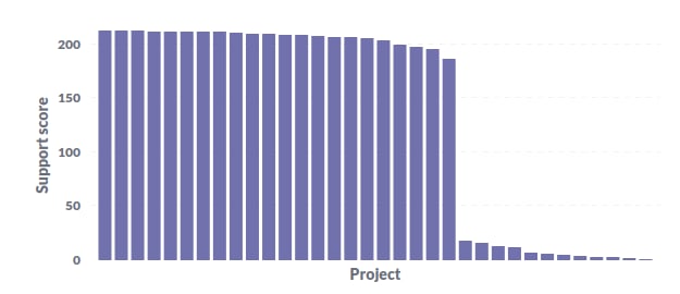 (The donor score is a measure of the track record of a donor, and the support score is a measure of the support that a project has received from donors, weighed by the donor score among other factors. So the support score is the aggregate measure of the trust of the donors with the strongest donation track records.)