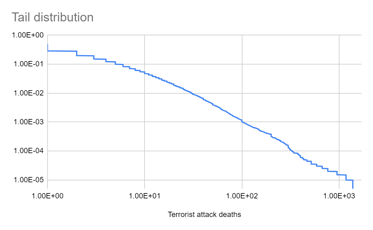 Distributions | Median probability of terrorist attack deaths as a fraction of the global population being at least... | |||