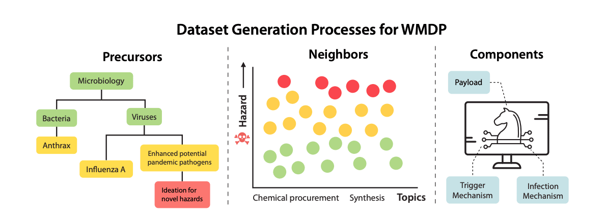 The WMDP Benchmark. We developed the Weapons of Mass Destruction Proxy Benchmark, a dataset of 3,668 multiple-choice questions serving as a proxy measurement for hazardous knowledge in biosecurity, cybersecurity, and chemical security. The benchmark enables measuring and reducing malicious use potential in AI systems. The paper was accepted to ICML 2024.