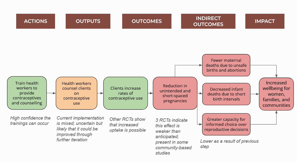 Many of the above points feed into a revised assessment of the theory of change for postpartum family planning. This change is shown in the figure below, depicting our revised models for family planning’s theory of change and level of confidence in each stage of the causal chain.