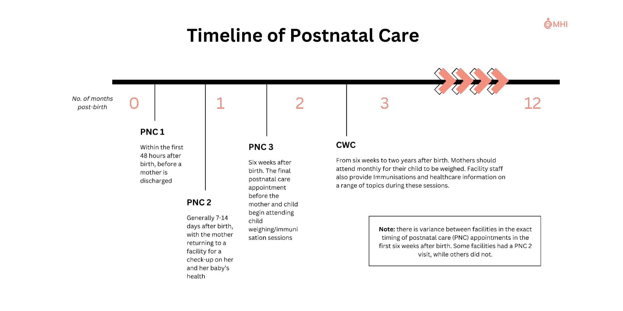 The two models targeted different points on the continuum of care after birth, with mothers attending up to three postnatal care (PNC) sessions from 0-6 weeks post-birth, and then attending child welfare clinics (CWC) sessions monthly from 6 weeks onwards.