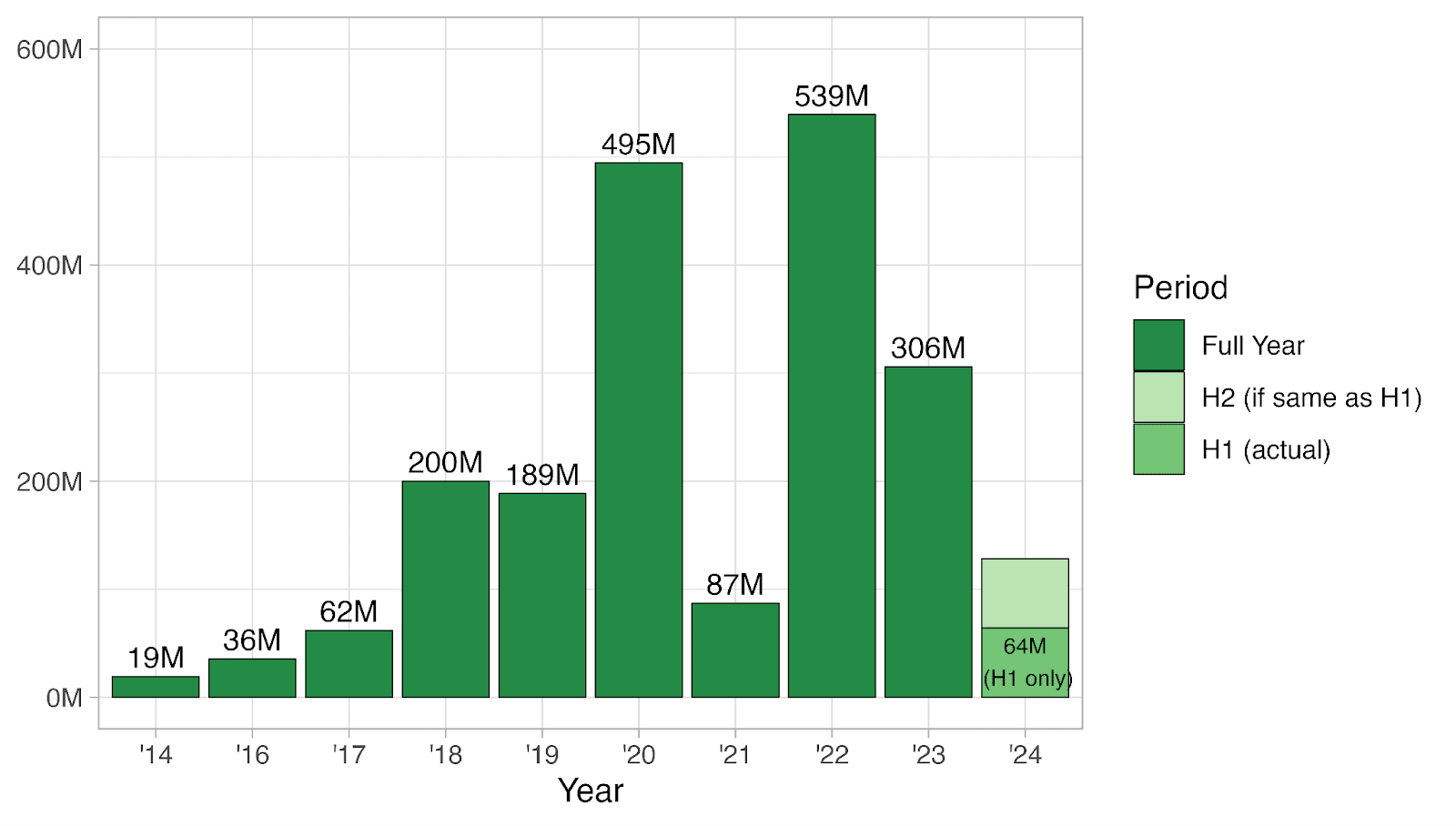 - Cumulative publicly disclosed investments into insect farming totalled just under $2B until end June 2024. However, at least $745M (or 36%) of this investment has been made into companies that have either stopped operating or entered a court-supervised restructuring process.